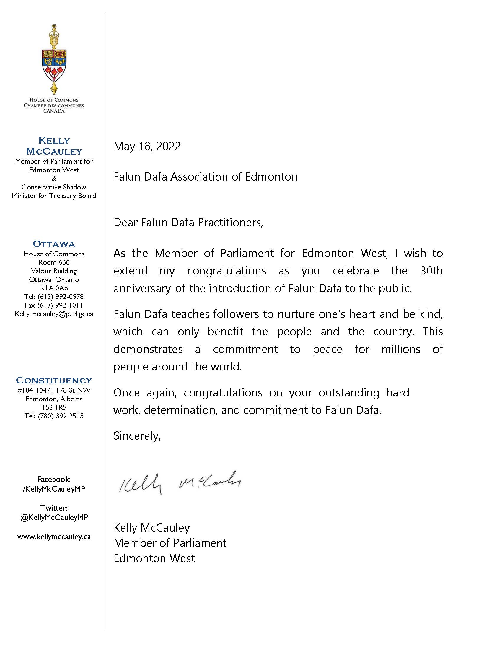 埃德蒙顿西区国会议员麦考利(Kelly McCauley)为法轮大法的利国福民而喝采,“法轮大法教导学员修心向善,这对民众和国家有百益而无一害,并为世界上数百万人的安乐做出了贡献。再次祝贺你们出色的工作和不屈的精神。”