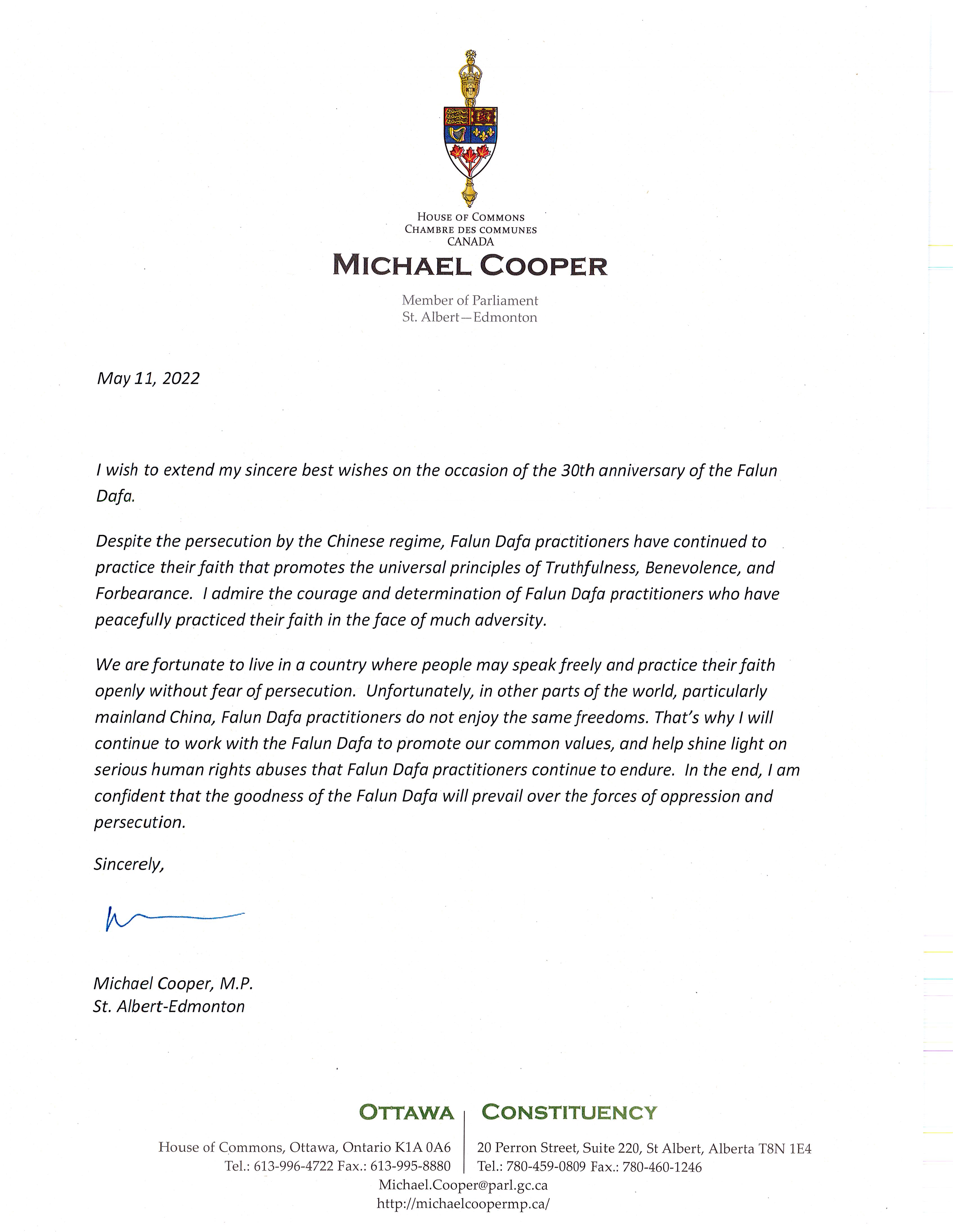 圣亚伯特-埃德蒙顿国会议员库伯(Michael Cooper)表达了自己对法轮功学员的钦敬之情,“尽管遭受中共的迫害,法轮大法学员始终如一地秉持对真、善、忍的信仰。在如此巨大的逆境中,法轮大法学员仍能和平地坚持他们的信仰,从中展现的勇气和决心令我敬佩。”