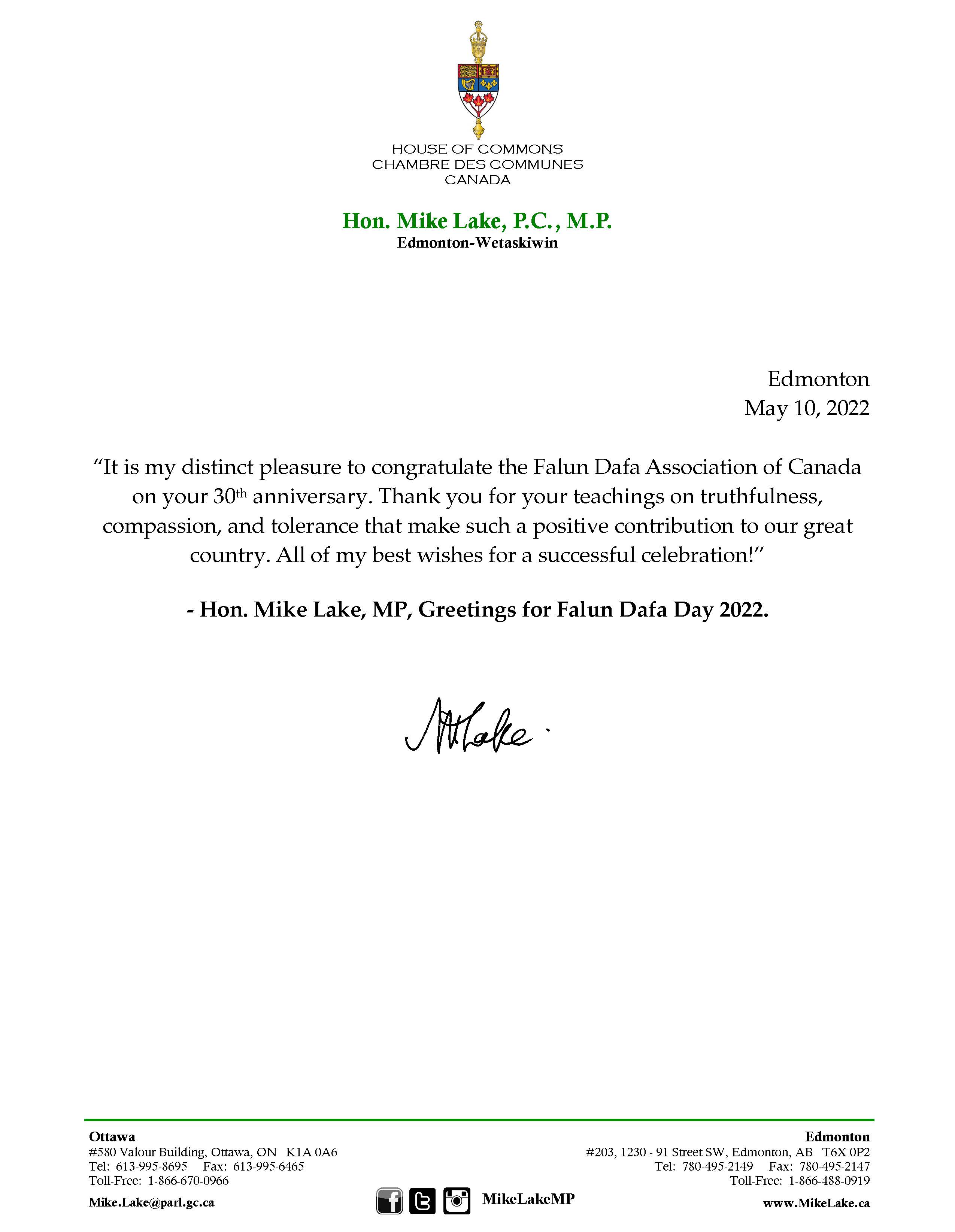 埃德蒙顿-Wetaskiwin国会议员莱克(Mike Lake)在贺信中说,“法轮大法传世三十周年之际,我非常荣幸地向加拿大法轮大法学会表示祝贺。感谢你们教导的真、善、忍原则为我们伟大的国家做出了积极的贡献。”
