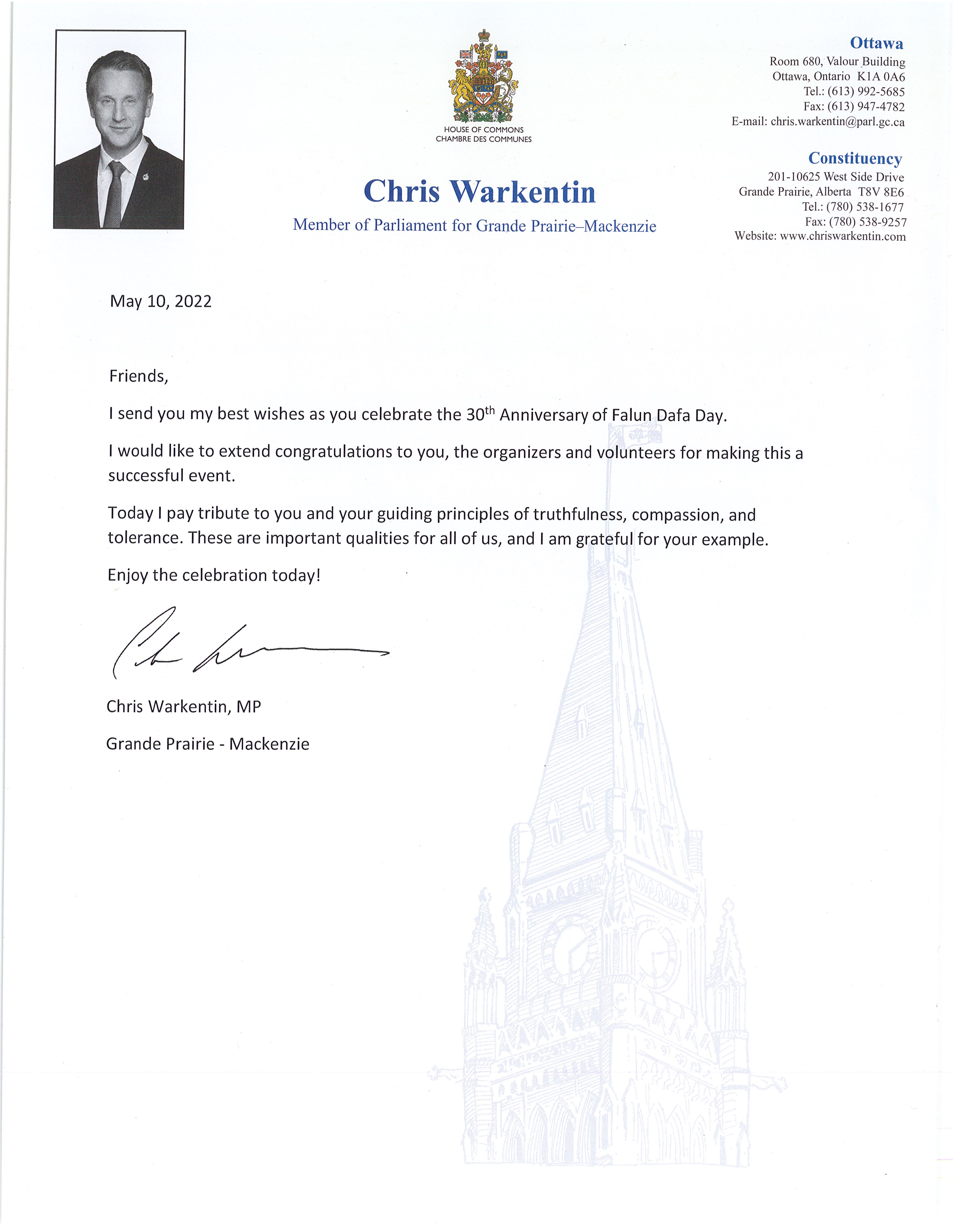 Grande Prairie-Mackenzie国会议员沃肯廷(Chris Warkentin)向法轮大法修炼者“致以最美好的祝愿”,并敬佩地表示,“我向你们和你们所遵循的真、善、忍致敬。对我们所有人而言,这些都是重要的品质,我非常感谢你们的以身作则。法轮大法团体也有力地提醒着我们,不能视自由为理所当然而不加珍惜。”