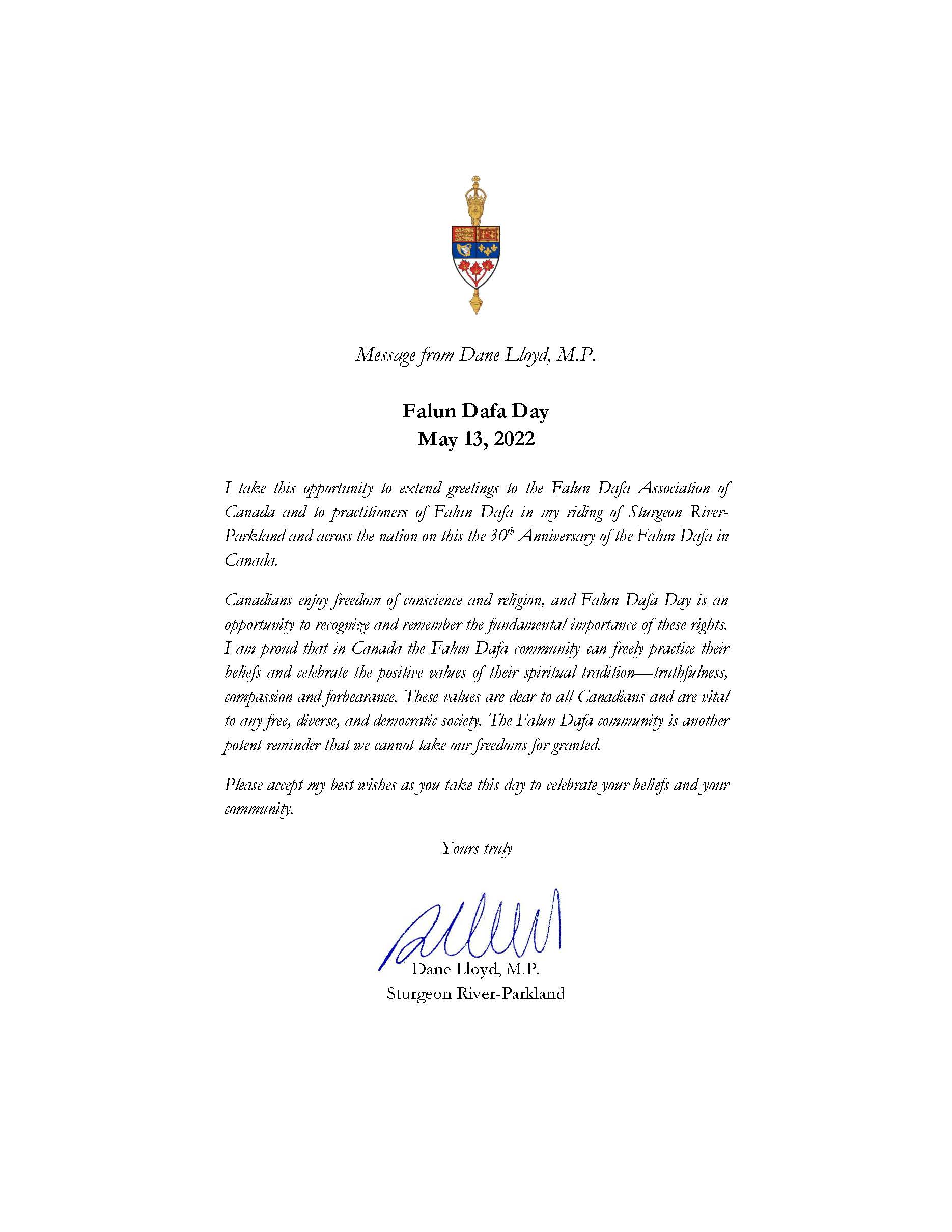 Sturgeon River-Parkland国会议员劳埃德(Dane Lloyd)说,“加拿大人享有信仰自由,法轮大法日是我们谨记这些根本而重要的权利的机会。我为法轮大法团体能够在加拿大自由地修炼和庆祝真、善、忍的精神传统而感到自豪。这些价值观对所有加拿大人而言都是宝贵的,也是任何自由、多元和民主社会所不可或缺的。”