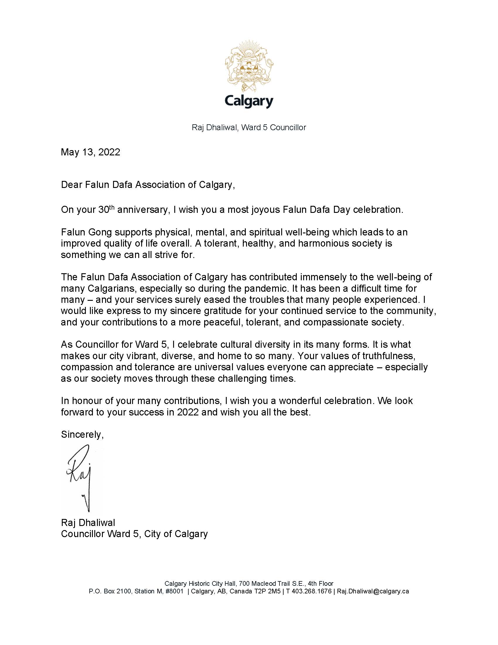 卡尔加里第五区市议员达利瓦尔(Raj Dhaliwal)表示,在法轮大法弘传30周年之际,“祝你们拥有一个最欢乐的法轮大法日庆典。”