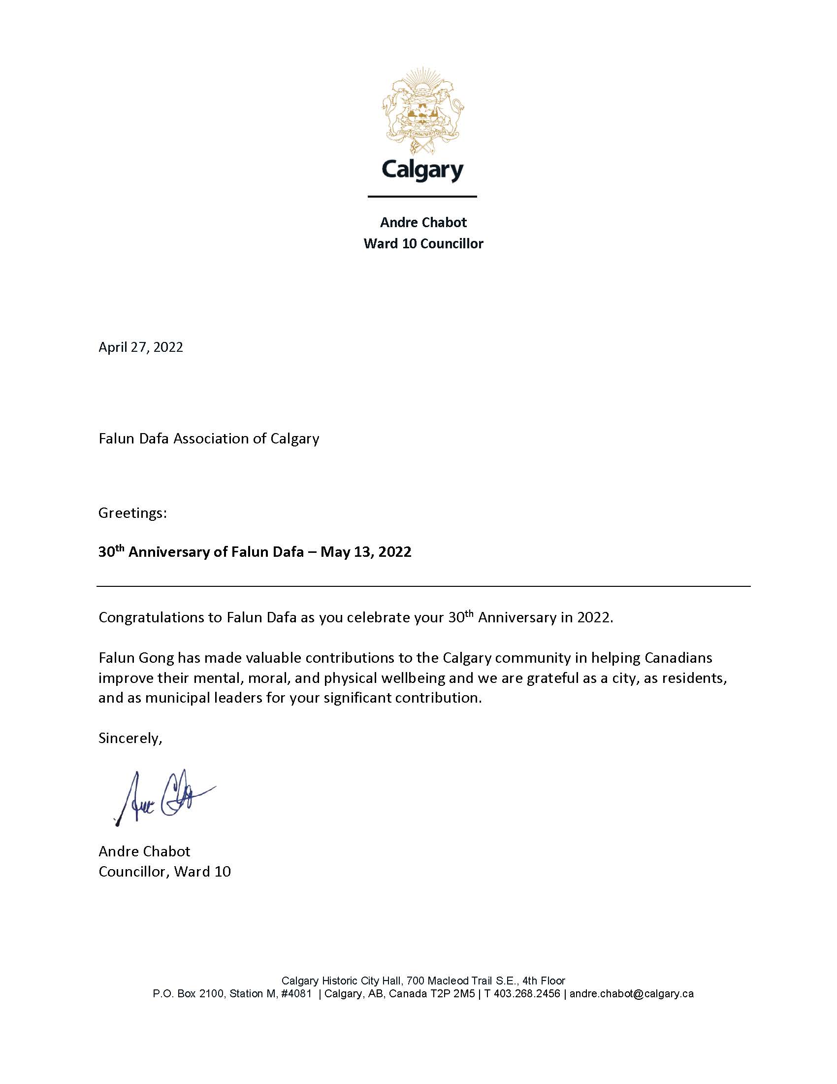 卡尔加里第十区市议员查伯特(Andre Chabot)祝贺法轮大法弘传30周年,并感谢法轮大法对社会的贡献,“法轮功帮助加拿大人促进了精神、道德和身体健康。城市、居民和市政领导人感谢你们所作的重要贡献。”