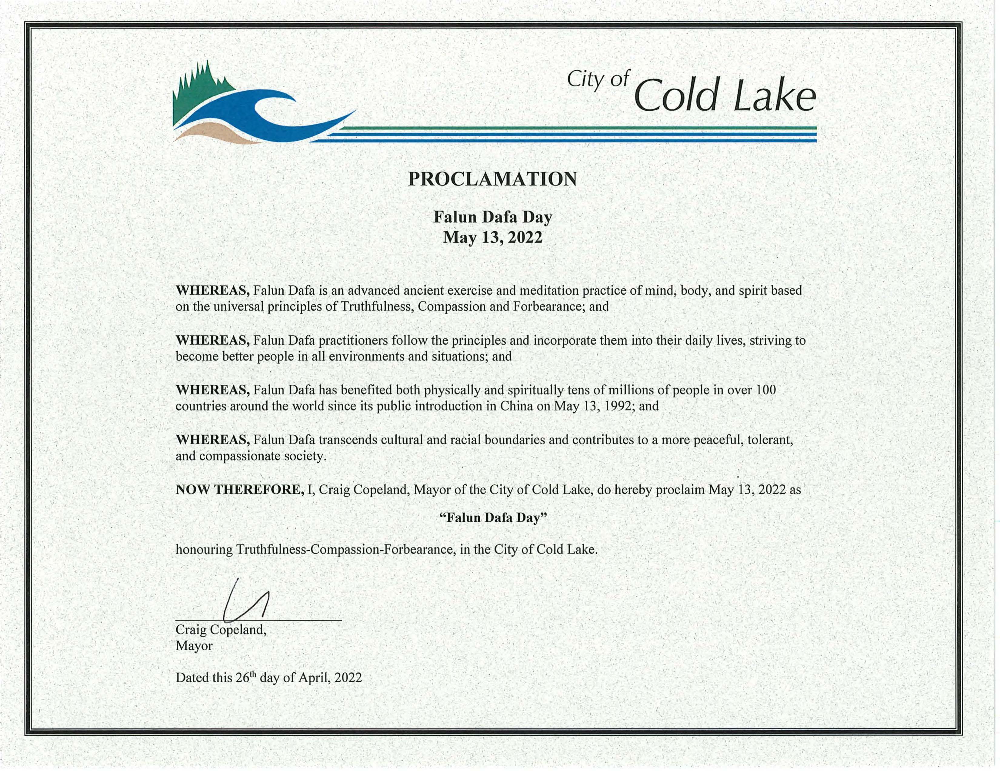 我,冷湖市市长克雷格·科普兰(Craig Copeland) 宣布2022年5月13日为“法轮大法日”,冷湖市向“真善忍”致敬。