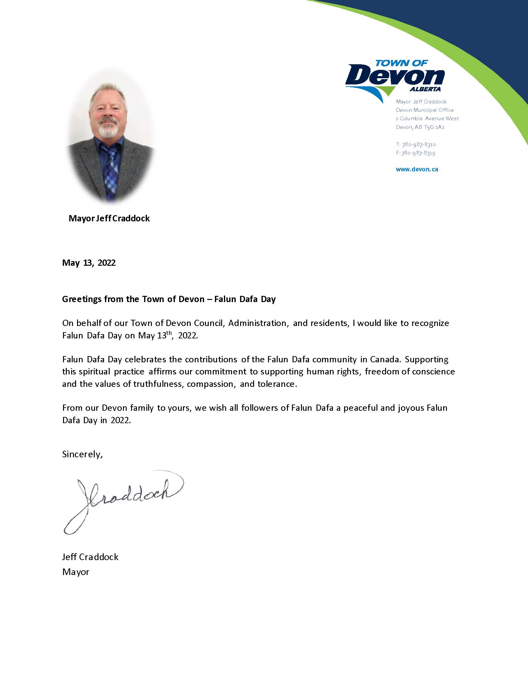 我谨代表德文镇议会、管理团队和居民,嘉奖2022年5月13日为法轮大法日。