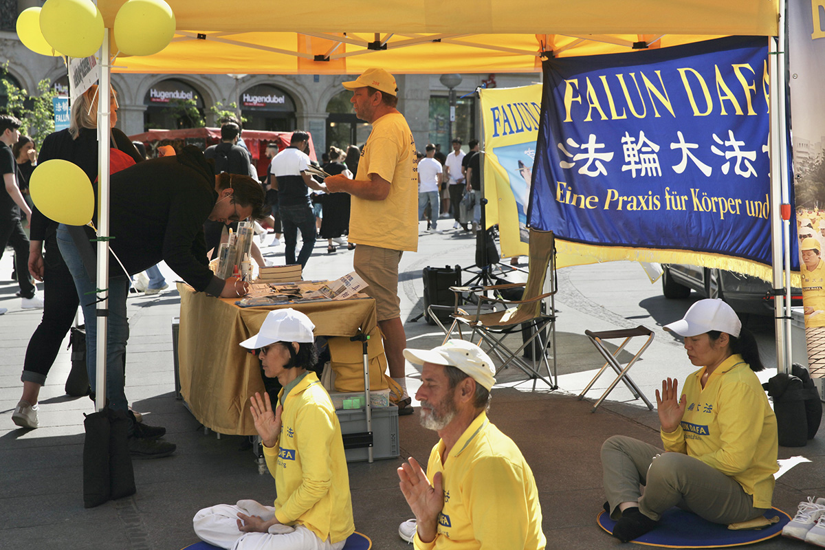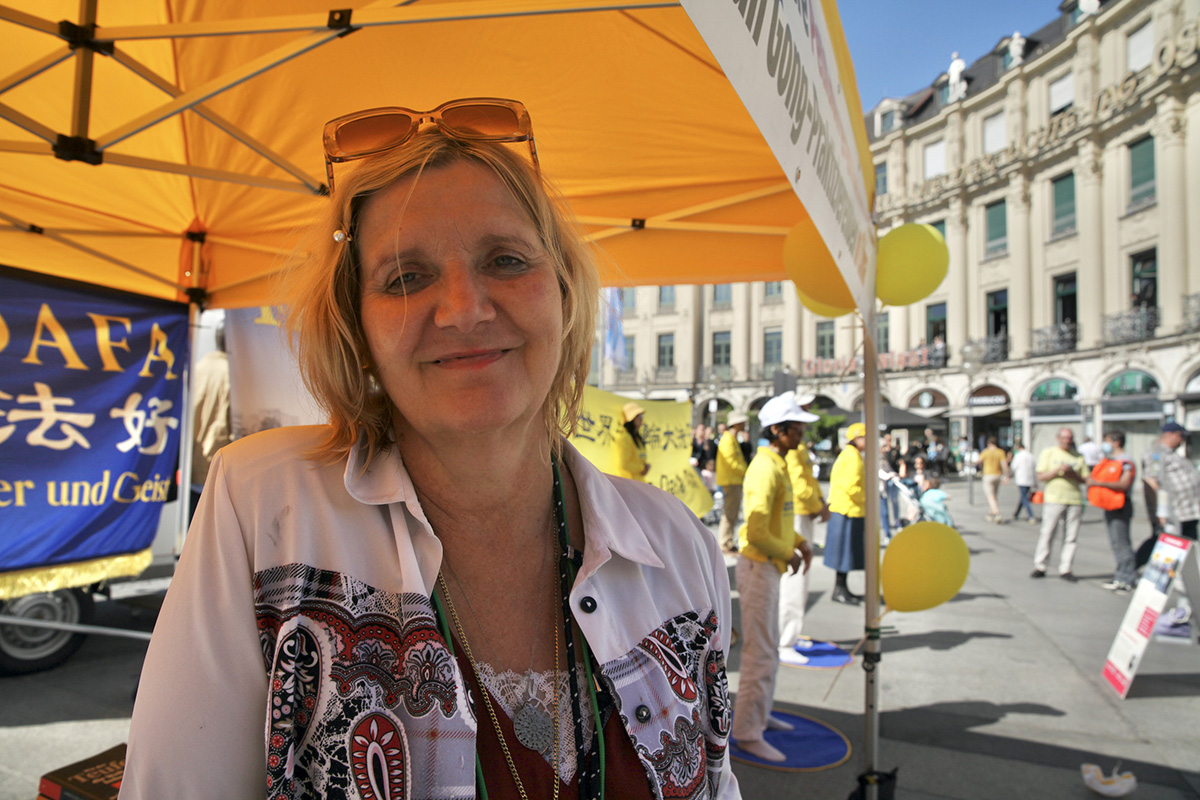 蔓茨女士(Martina Manz)在旅馆前台工作,经过卡尔斯广场,看到法轮功学员展示功法,她感到这些人非常平和、安静。她跟法轮功学员交谈之后,签名制止中共活摘法轮功学员器官。