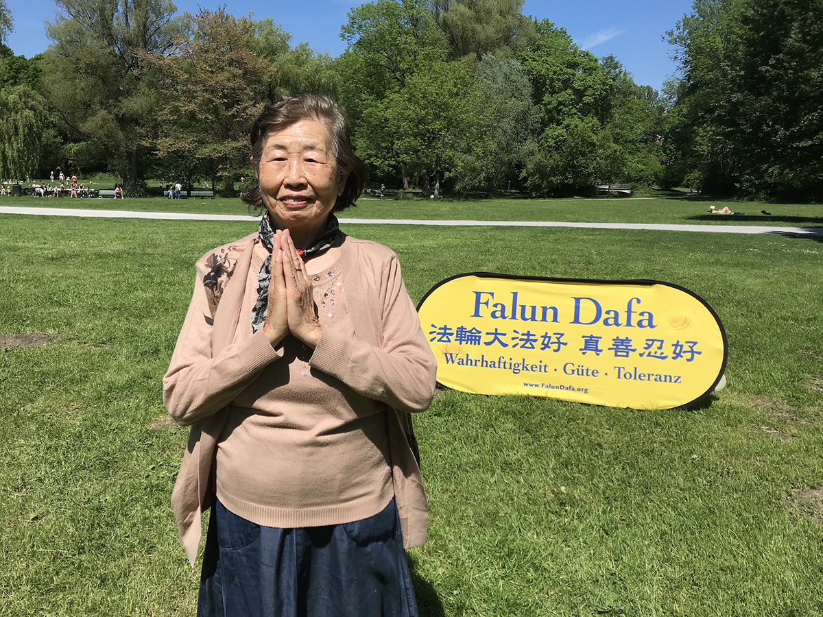 来自慕尼黑的法轮功学员潘惠琴今年八十四岁,从一九九五年七月开始修炼法轮功。“我非常感恩师父”,她说,如果不是修炼法轮功,可能早就没有了。修炼之前,她的脸上出现症状,长了很多不好的东西,治疗了半年,越治越厉害,越长越多。当时,儿子曾参加过李洪志先生的报告会,开始修炼法轮功。儿子劝她也修炼,她觉得自己的病好不了,不想炼。儿子劝她,只有炼功才能好。就这样,潘女士参加了当地组织的九天讲法录像班,走入了修炼的行列。