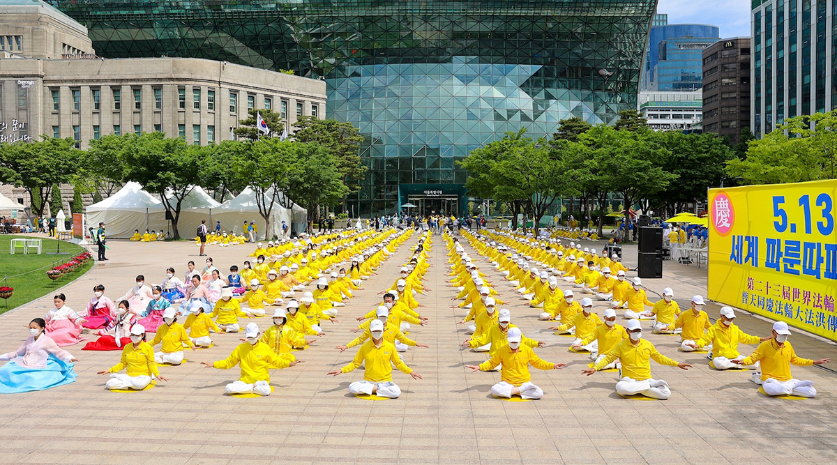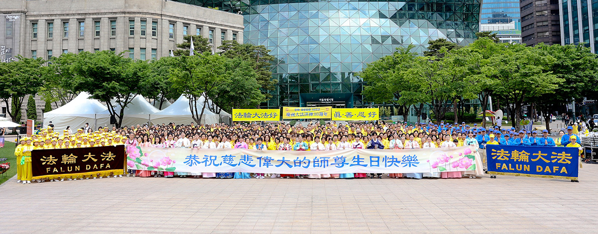五月十三日也是法轮功创始人——李洪志大师的华诞。功法演示结束后,全体法轮功学员怀着虔诚的心,合照纪念,庆祝李洪志师父华诞,感谢李洪志大师在混乱的时代中,于三十年前向世间传出以真善忍为核心的法轮大法。韩国全体学员感谢李洪志师父的佛恩浩荡,并怀着无比感激的心情恭贺师尊华诞。