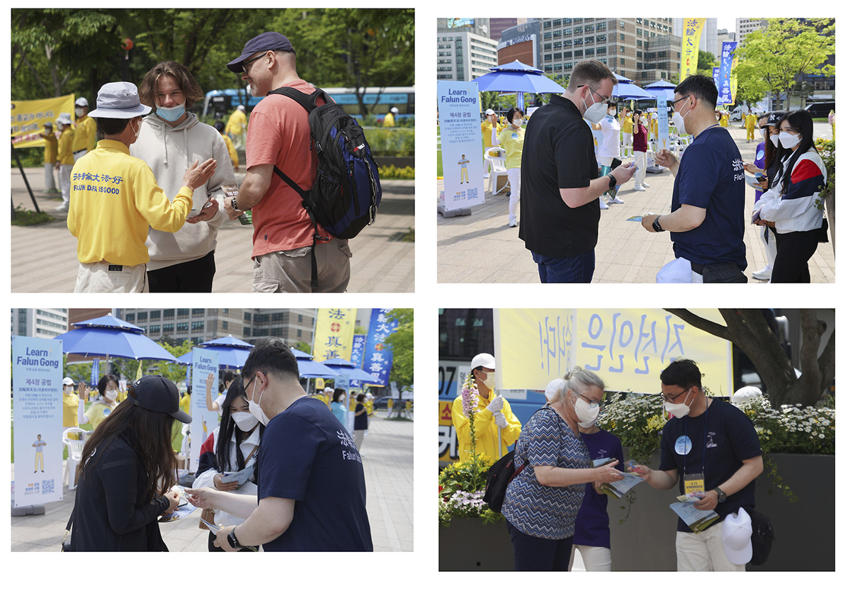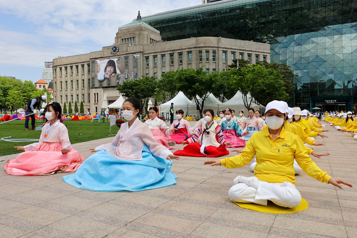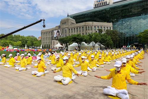 活动当天阳光明媚,风和日丽。来自韩国各地的法轮功学员一大早聚集在首尔广场,向上班途中的市民展示法轮功功法。因为首尔广场位于首尔市政厅前,周遭遍布高档酒店与写字楼,所以许多公务员和上班族都在上班路上观看了法轮功功法演示。当天,法轮功学员身穿明亮的黄色上衣和白色长裤,清新亮丽,与广场绿色的草坪相得益彰,让活动更加引人注目。