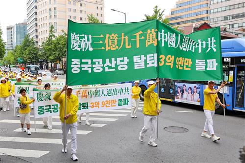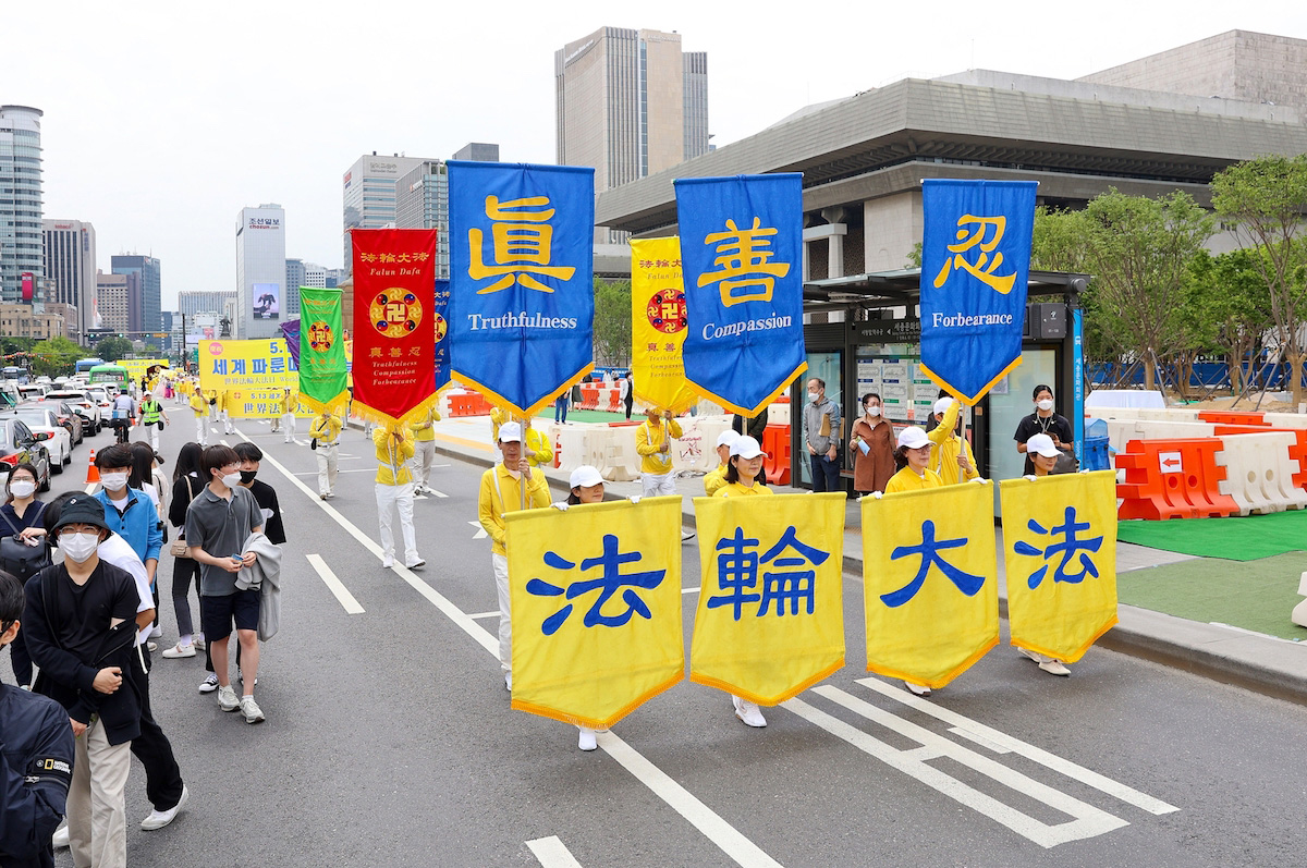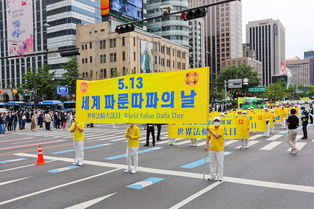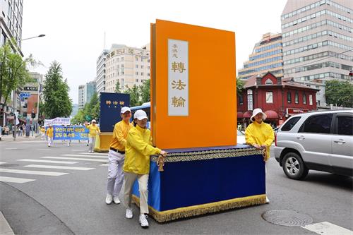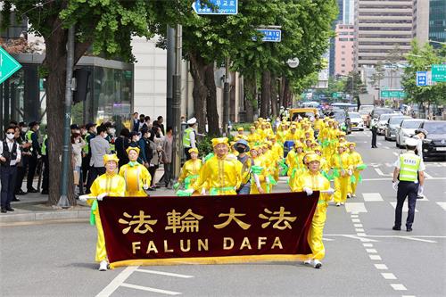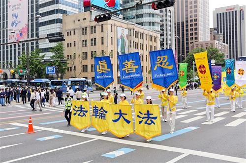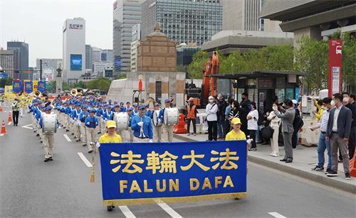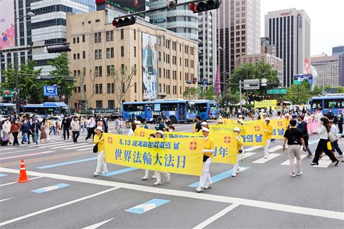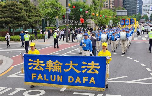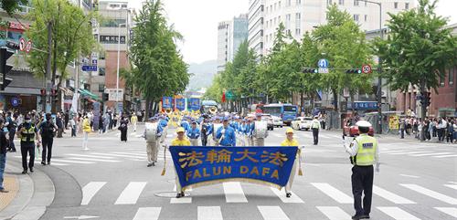 紧接着,全体学员根据事前安排好的位置,有条不紊地加入游行队伍中,并领取了各自的横幅,整备待发。一切准备就绪后,在中午十二点,当天活动的重头戏——总长三公里的大游行伴随著天国乐团的乐声正式拉开了帷幕。法轮功学员从首尔市厅广场开始,途径韩国新闻中心、东亚日报报社、美国大使馆、政府综合办公大楼、光化门、曹溪寺入口、钟阁地铁站入口和乙支路地铁站入口后,重新返回市厅广场。