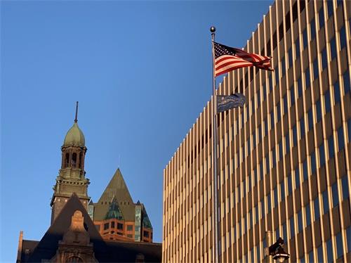 五月十一日清晨七点十五分,在威斯康星州最大的城市密尔沃基(Milwaukee)市府前的上空,蓝色的法轮大法日旗帜,与美国的星条旗一起在阳光下冉冉升起,庆贺法轮大法在世界各地弘传三十周年。