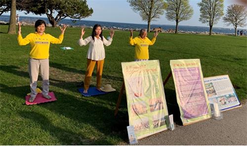 密尔沃基市的部分法轮功学员们于五月十三日下午,以炼功和讲真相的形式,来庆贺伟大师尊的七十一华诞和大法弘传三十周年。她们在市中心的密西根湖边集体炼功,向过往的民众讲真相,发放法轮功真相资料。
