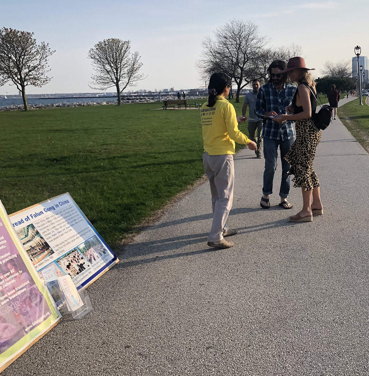 有一位男士听了法轮功学员在中国受中共迫害,甚至被活摘器官的真相后,很难过;当得知全球法轮功学员持续二十三年的一直在反迫害,在传播真相,他感动地说,“你这是在做天堂的事情, 请一定坚持下去。”
