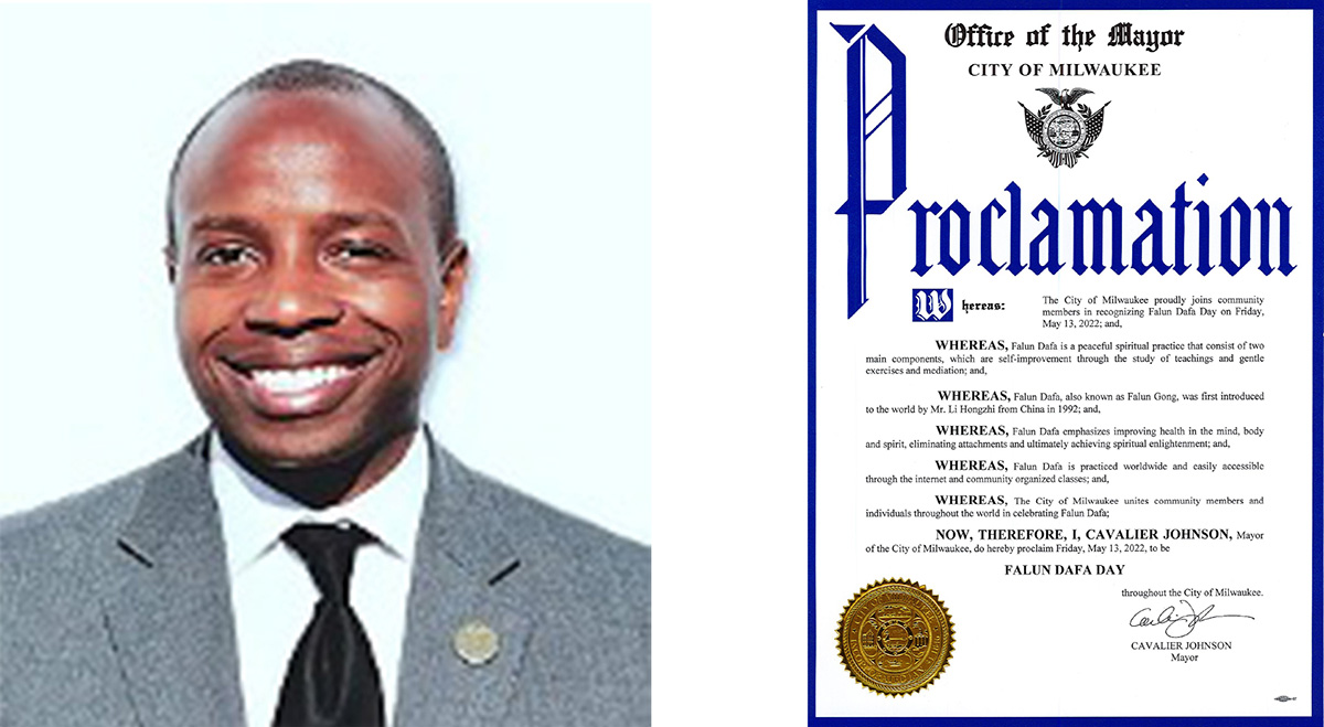 密尔沃基市长卡瓦列尔·约翰逊(Cavalier Johnson)先生颁布褒奖令,自豪地宣布五月十三日为本市法轮大法日,并升旗五日以示庆贺。