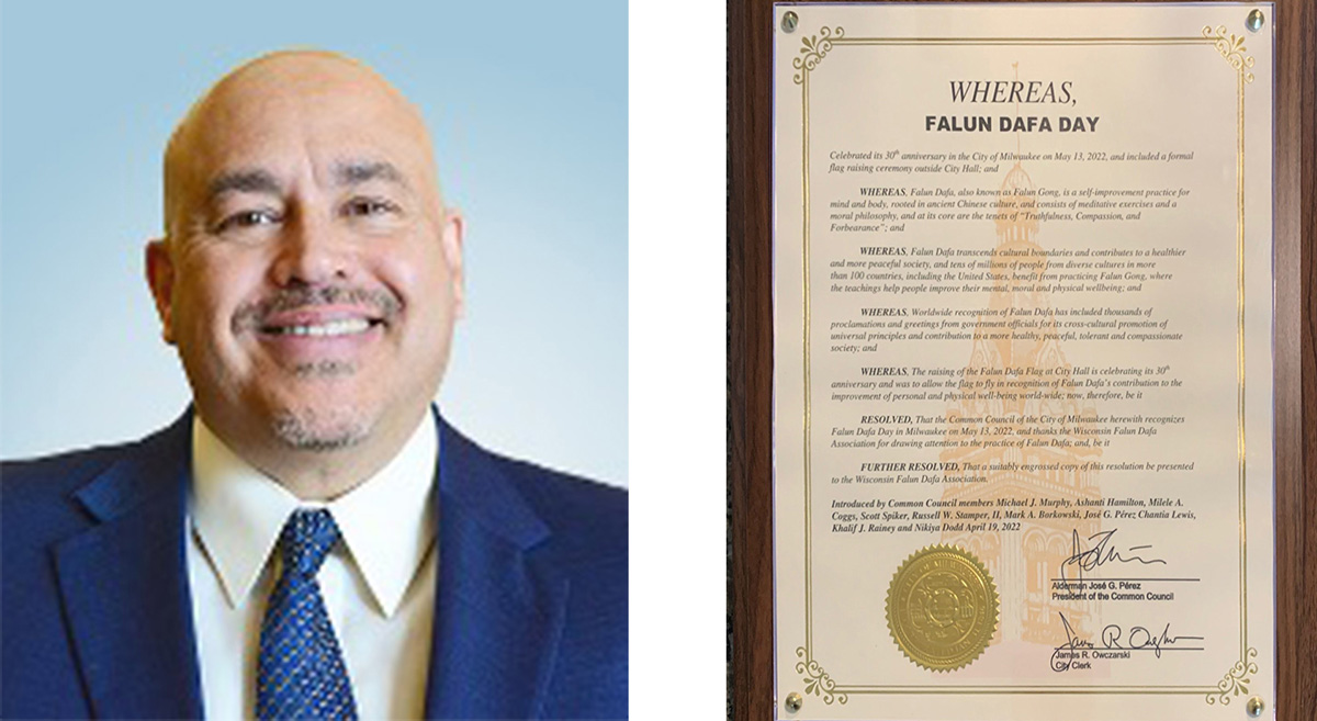 密尔沃基市共同理事会主席何塞·佩雷斯(Jose G. Perez)与八位成员一起颁发了表彰法轮大法的决议。他在决议中说,“法轮大法超越了文化的界限,有助于建立一个更健康、更和平的社会,包括美国在内的一百多个国家中来自不同文化背景的数千万人从修炼法轮功中受益,法轮功的教义帮助人们改善身心健康状况。”“全世界对法轮大法的认可包括数以千计的褒奖和政府官员的问候,因为法轮大法在不同文化中促进了普世原则,对一个更健康、和平、宽容和富有同情心的社会做出了贡献。在市政厅升起法轮大法的旗帜是为了庆祝其三十周年,是为了让旗帜飘扬,以表彰法轮大法对改善全世界个人和身体健康的贡献。”