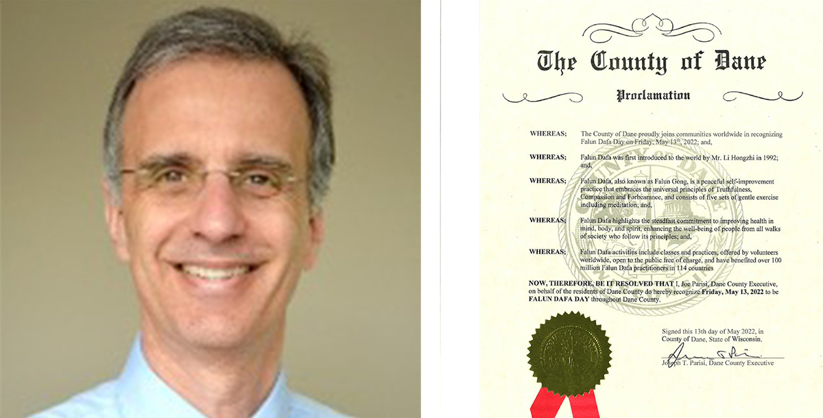 丹恩郡行政长官乔·帕里西(Joe Parisi)也发布褒奖,代表丹恩郡的居民,特此确认二零二二年五月十三日星期五为整个丹恩郡的法轮大法日。他在公告中指出,由李洪志先生传授,“法轮大法突出了对改善身心健康的坚定承诺,提高了遵循其原则的社会各界人士的幸福感。”