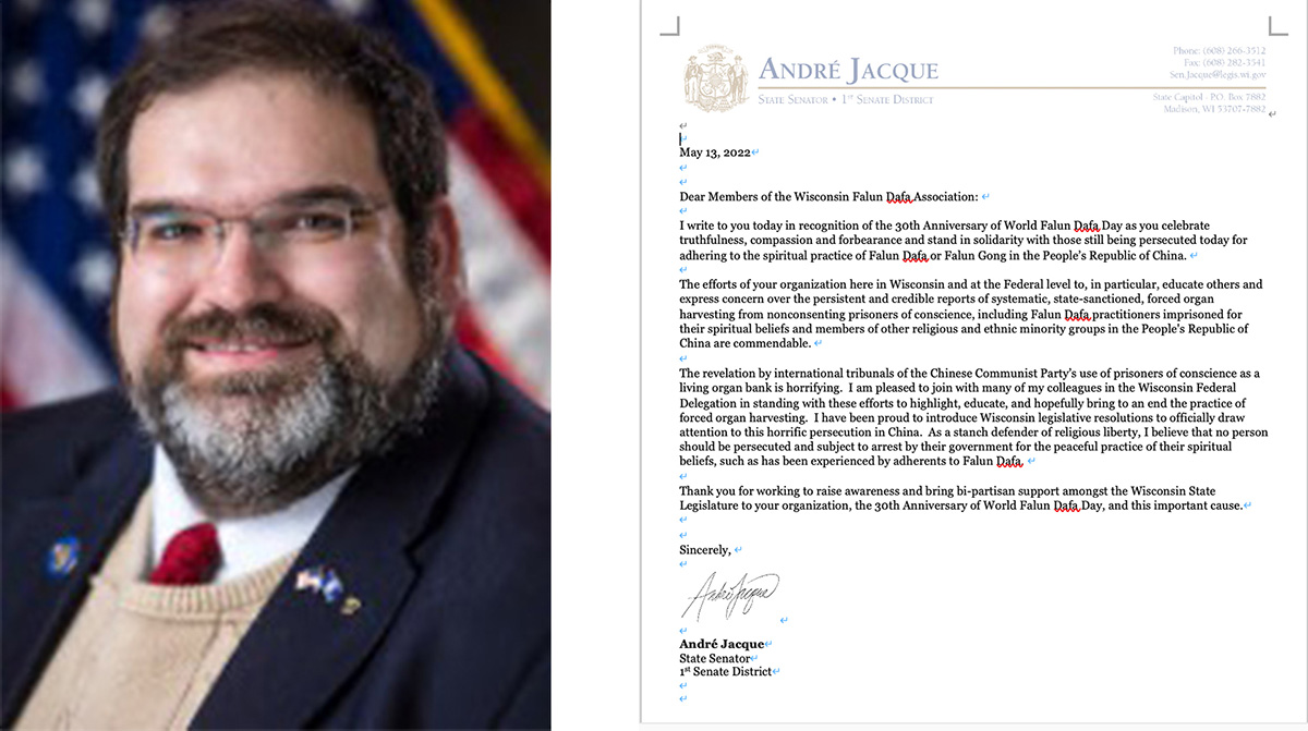 威斯康星州参议员安德烈·雅克(André Jacque)也发来了纪念法轮大法弘传三十周年的祝贺信。他说,“因为你们在庆祝真善忍,并声援那些今天仍因坚持在中国修炼法轮大法或法轮功而被迫害的人。”他高度赞扬海外大法弟子的努力,“特别是教育他人,使人们对持续的、可信的报告给以关注,即系统的、国家认可的、强迫摘取良心犯的器官,包括因精神信仰而被监禁的法轮大法弟子和对中国其他宗教和少数民族成员的迫害,是值得赞扬的。”