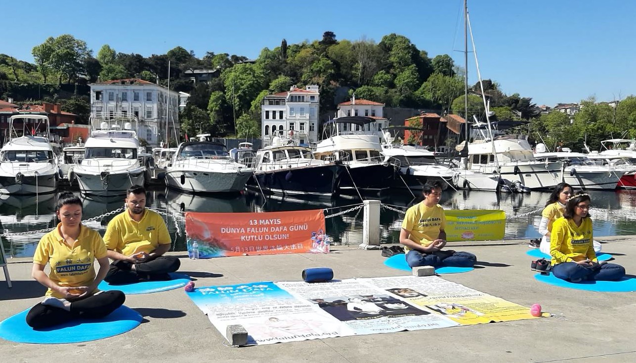 五月十三日,法轮功学员首先前往中共驻伊斯坦布尔领馆,抗议中共对法轮功长达二十二年的迫害。当天,许多路人经过时停下脚步,观看法轮功学员炼功,了解法轮功真相。