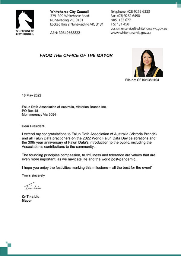 博士山区所属白马市(The City of Whitehorse)市长刘昱婷(Cr Tina Liu)女士发来贺信,副市长马苏德(Cr Denise Massoud)女士以及多位议员到场致辞,他们都感佩法轮大法为社区做出的杰出贡献。