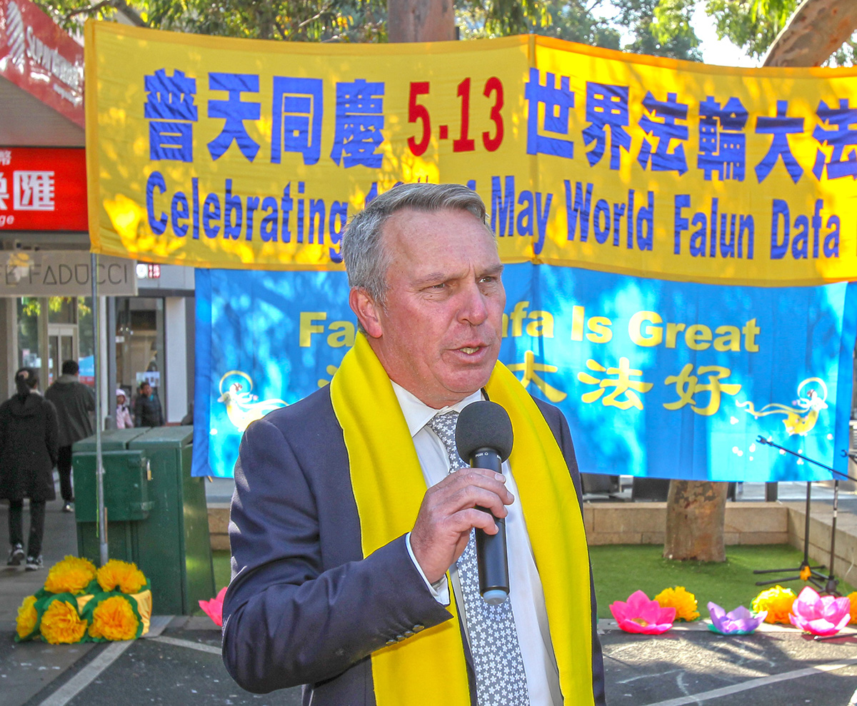 白马市议员曼罗(Cr Andrew Munroe)表示,自己能来参加世界法轮大法日的庆祝活动非常开心。