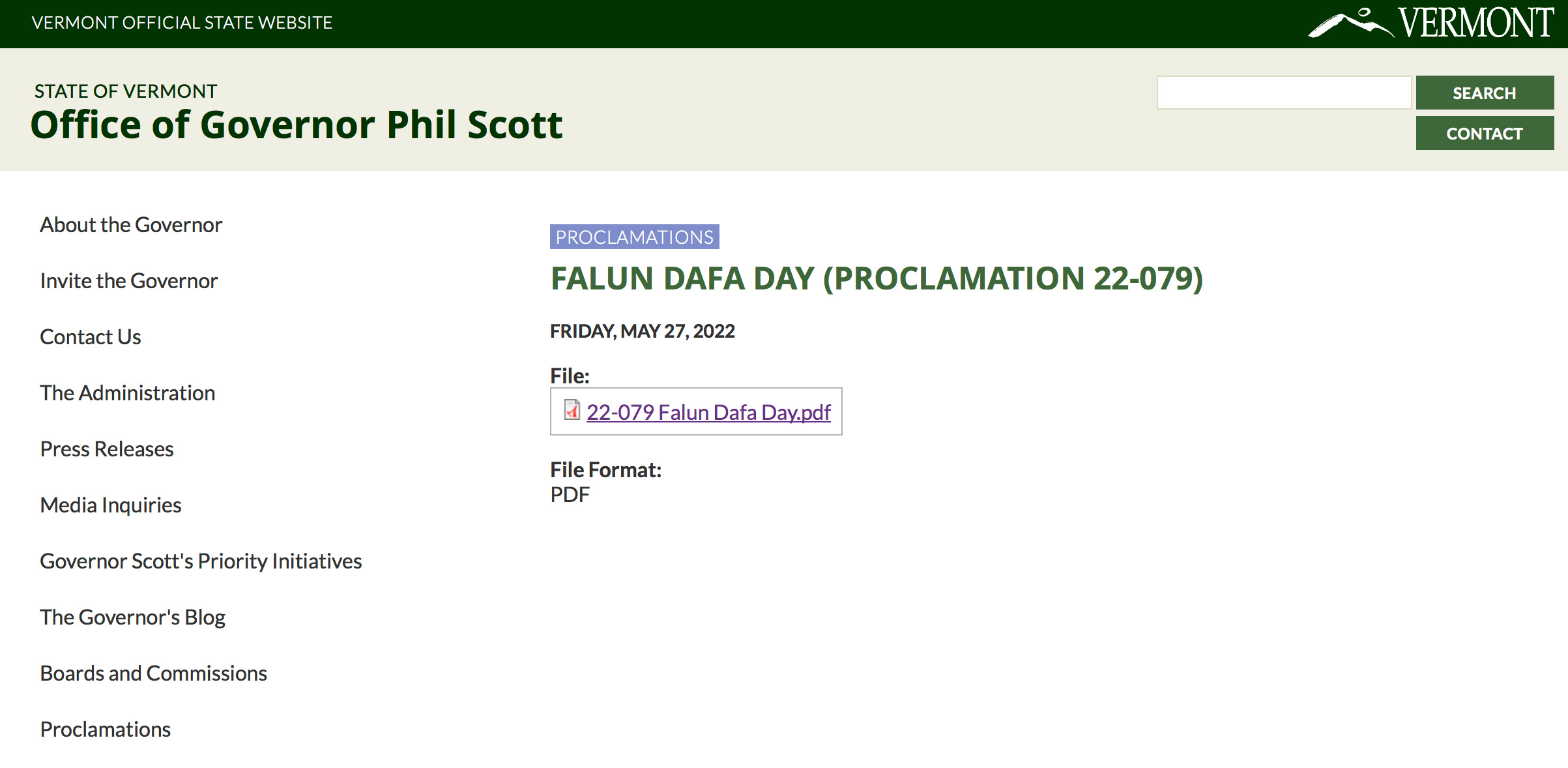 【明慧网二零二二年五月二十八日】美国佛蒙特州州长菲利浦·斯科特(Philip Scott)颁发褒奖状,宣布二零二二年五月三十一日为“佛蒙特州法轮大法日”。并在佛蒙特州州政府的官方网站上刊登褒奖令,鼓励佛蒙特人共庆法轮大法日。