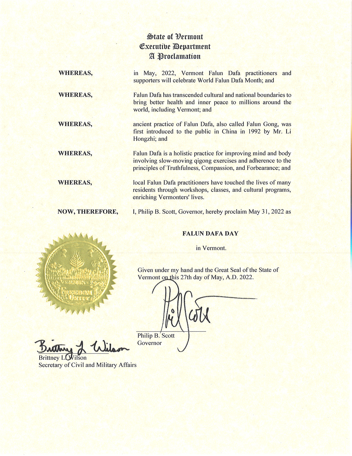 因此,我,菲利浦·斯科特,州长,在此宣布二零二二年五月三十一日是佛蒙特州的法轮大法日。
