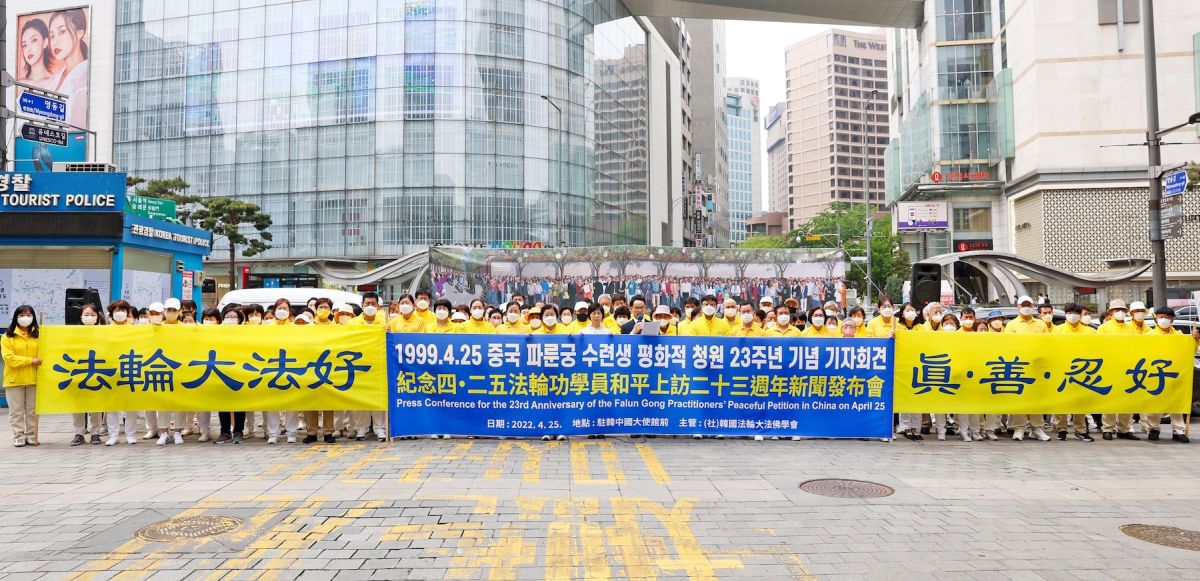 ![]() 图1: 二零二二年四月二十五日,韩国法轮功学员聚集在位于首尔明洞的中国总领事馆前举行纪念“四·二五和平请愿”二十三周年纪念活动。 |