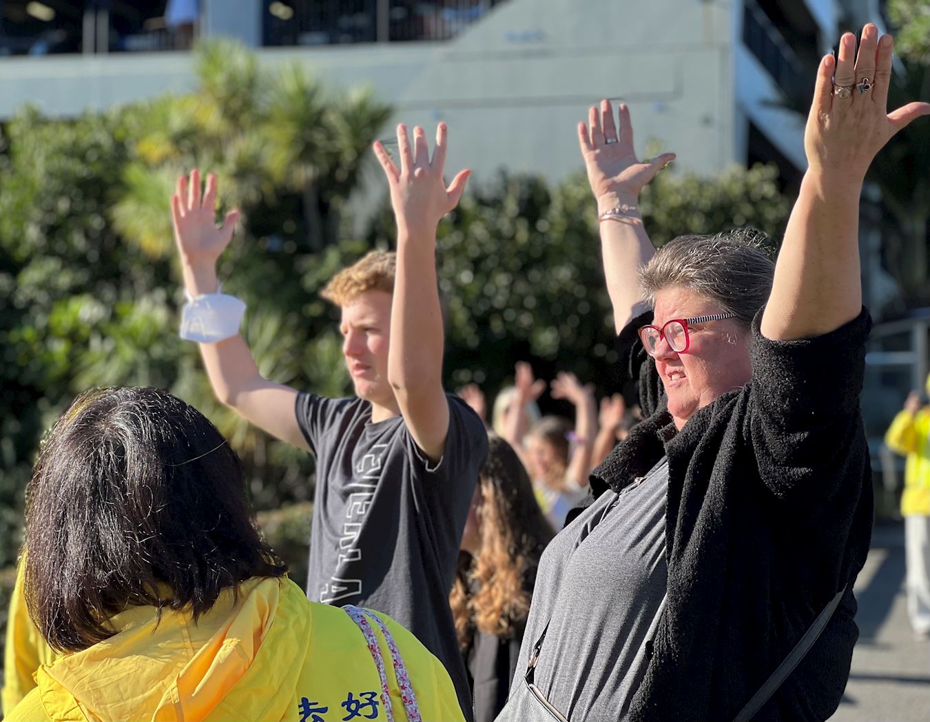 宝莲·海廉(Pauline Hilliam)是一位农场主,她也在一边学炼法轮功的功法动作。她说:“我在炼第二套功法两侧抱轮时,感觉到整个身体都被加强了,似乎觉得自己变高了,同时身体也变轻松了,十分的祥和平静。今天我特别高兴能遇见他们(法轮功学员),他们有自己的信念,并且成为了更好的人。这么祥和、让人放松的功法,真的不多见。”