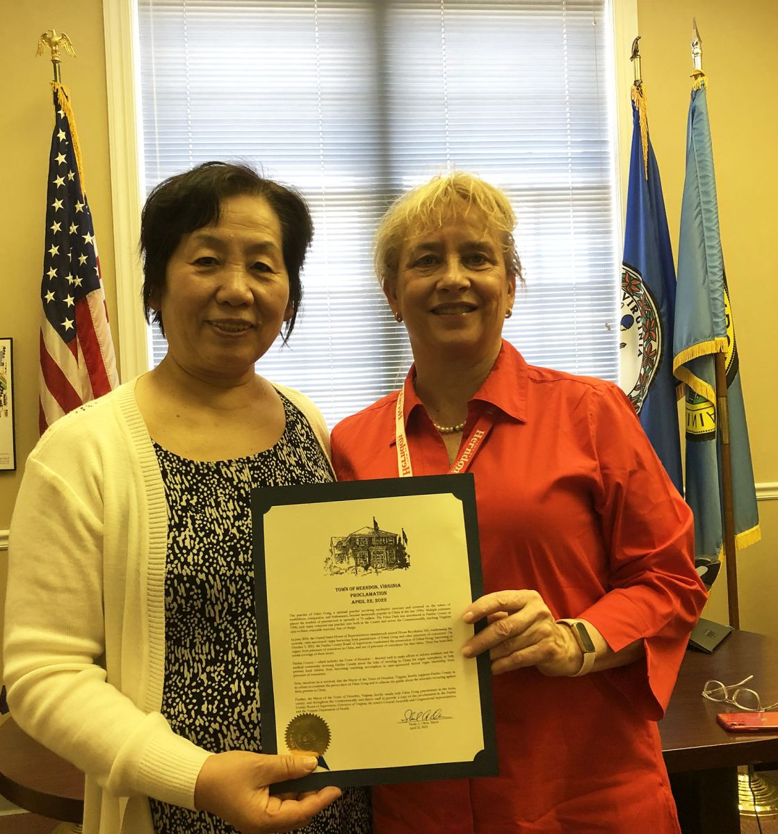 【明慧网二零二二年五月六日】二零二二年是法轮功传世三十周年。四月二十二日,美国弗吉尼亚州的赫恩登镇(Herndon)颁发对法轮功的褒奖,市长奥莱姆(Olem)接见了当地法轮功学员并颁发褒奖。