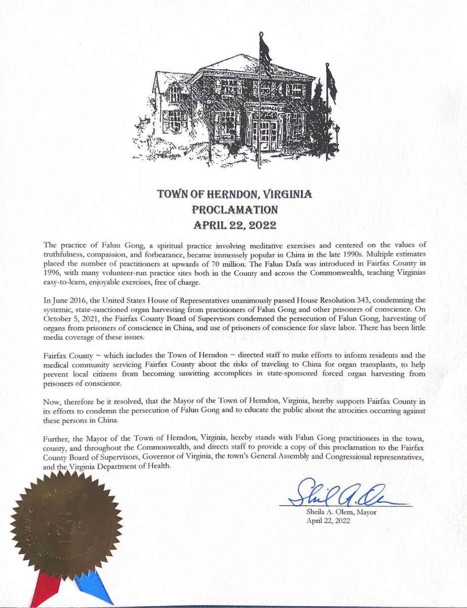 四月二十二日,弗州的赫恩登镇(Herndon)颁发对法轮功的褒奖,支持法轮功,谴责中共对法轮功学员的迫害,教育当地居民关于去中国大陆进行器官移植的危险性,不要无意中成为中共的罪恶帮凶。