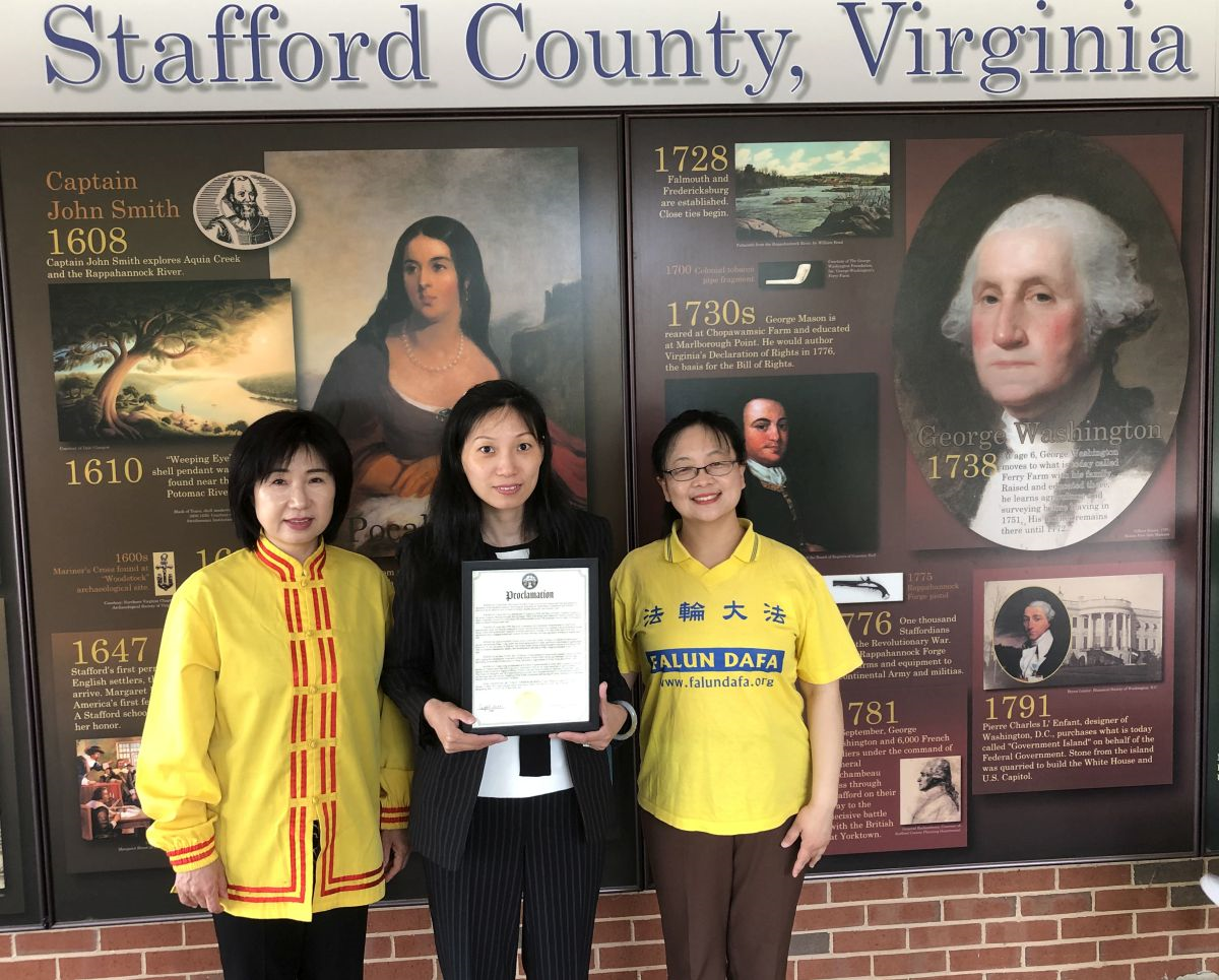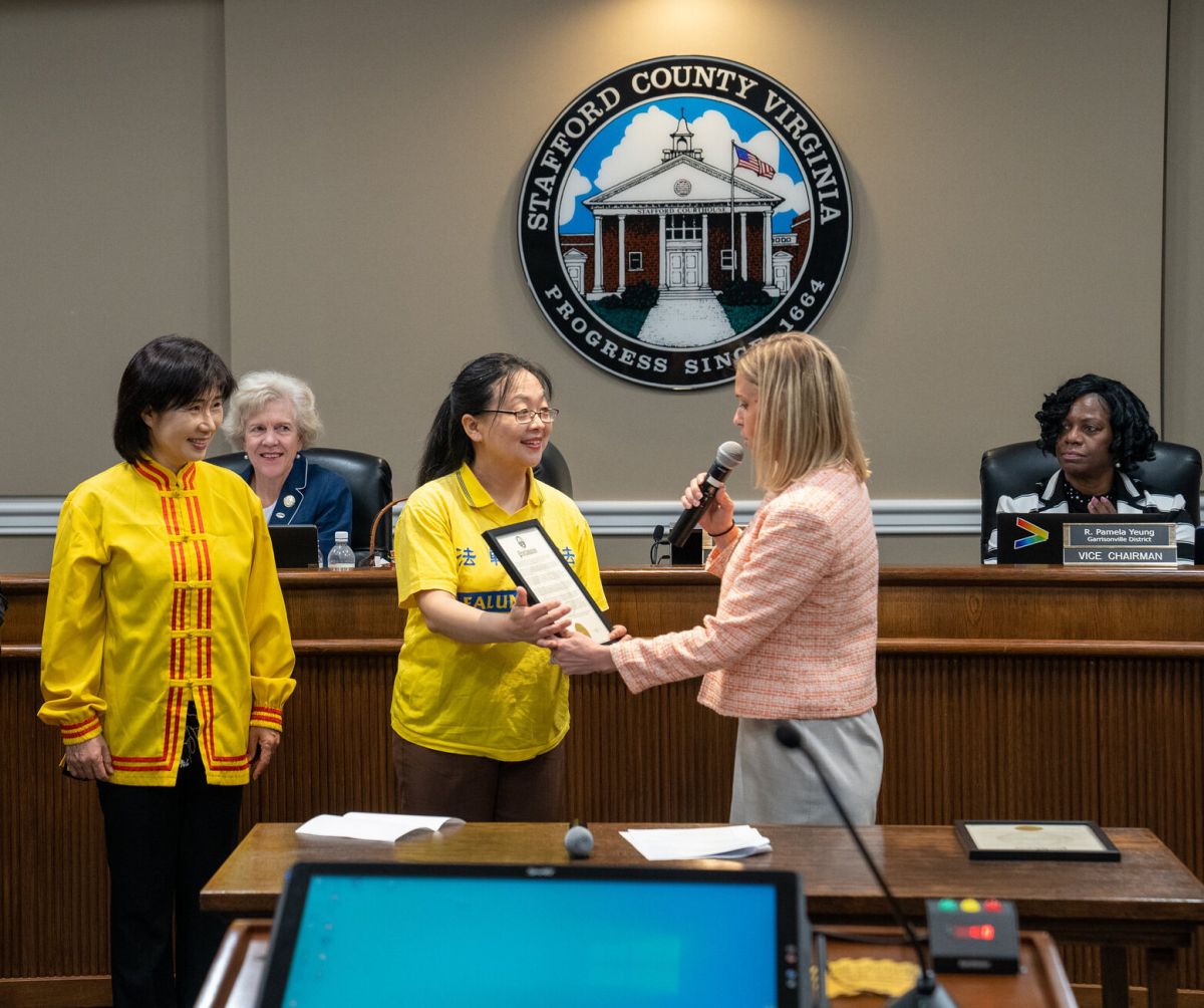 五月三日,弗吉尼亚州斯塔福德(Stafford County)郡宣布二零二二年五月十三日,为该郡的“法轮大法日”,并邀请当地法轮功学员前往郡议会,举行褒奖仪式。