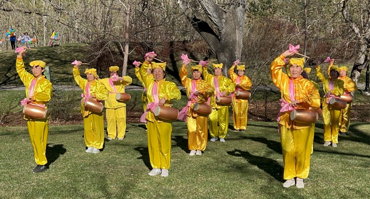 之后,腰鼓队成员在《法轮大法好》的歌声伴奏下,身着明黄炼功服,头裹同色头巾,踩着整齐的步伐,打起腰鼓。鼓声阵阵,铿锵有力,成员们不时变换着队形,前进、后退、转身,吸引了公园内散步的行人驻足观看。