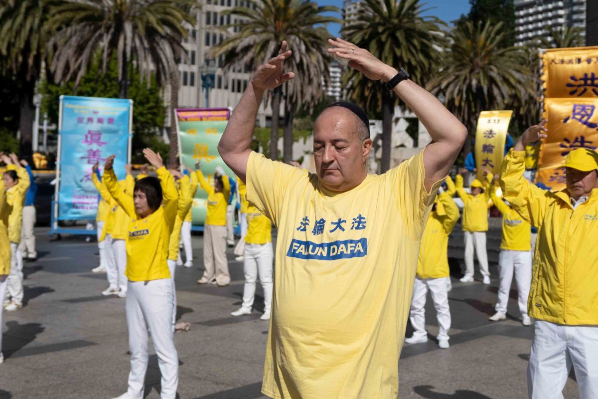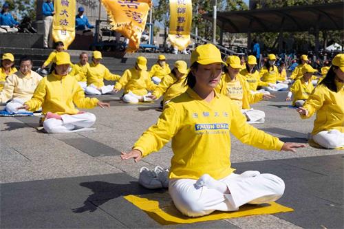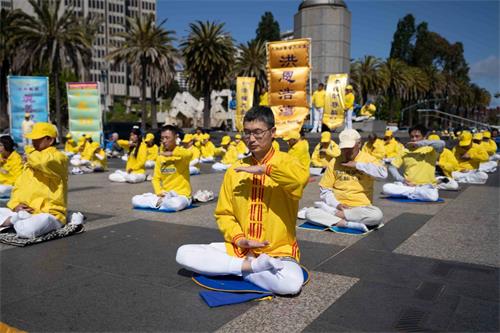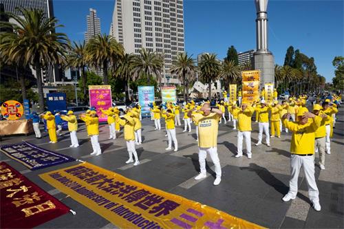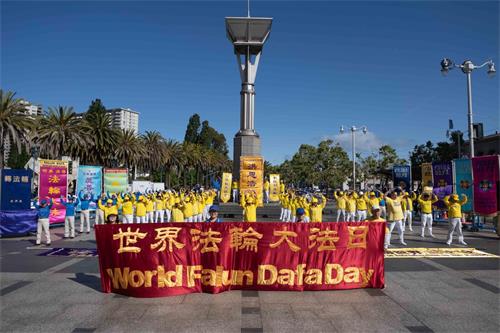星期六上午九点,法轮功学员首先在旧金山渡轮大厦(Ferry Building)广场前集体炼功,展示祥和优美的功法,庆祝法轮大法日。许多游客被吸引,了解什么是法轮功。还有的人看到这么祥和的炼功场面,主动学炼法轮功。