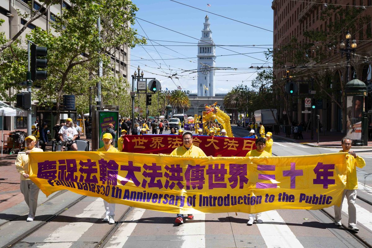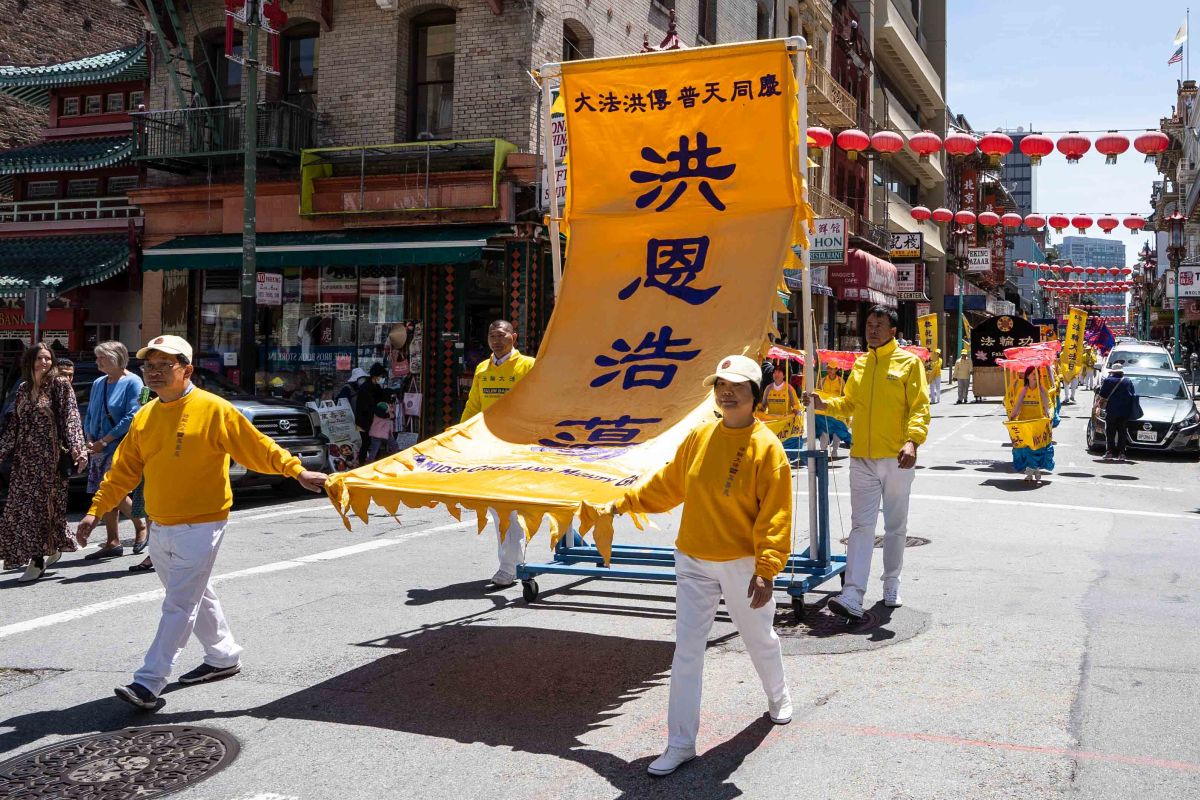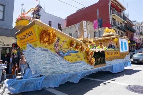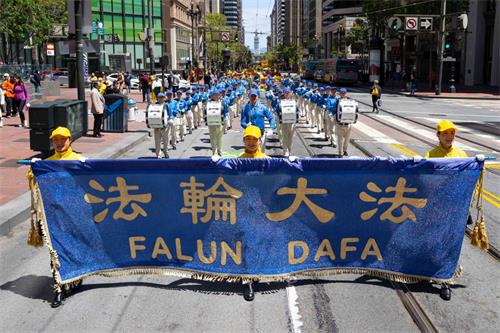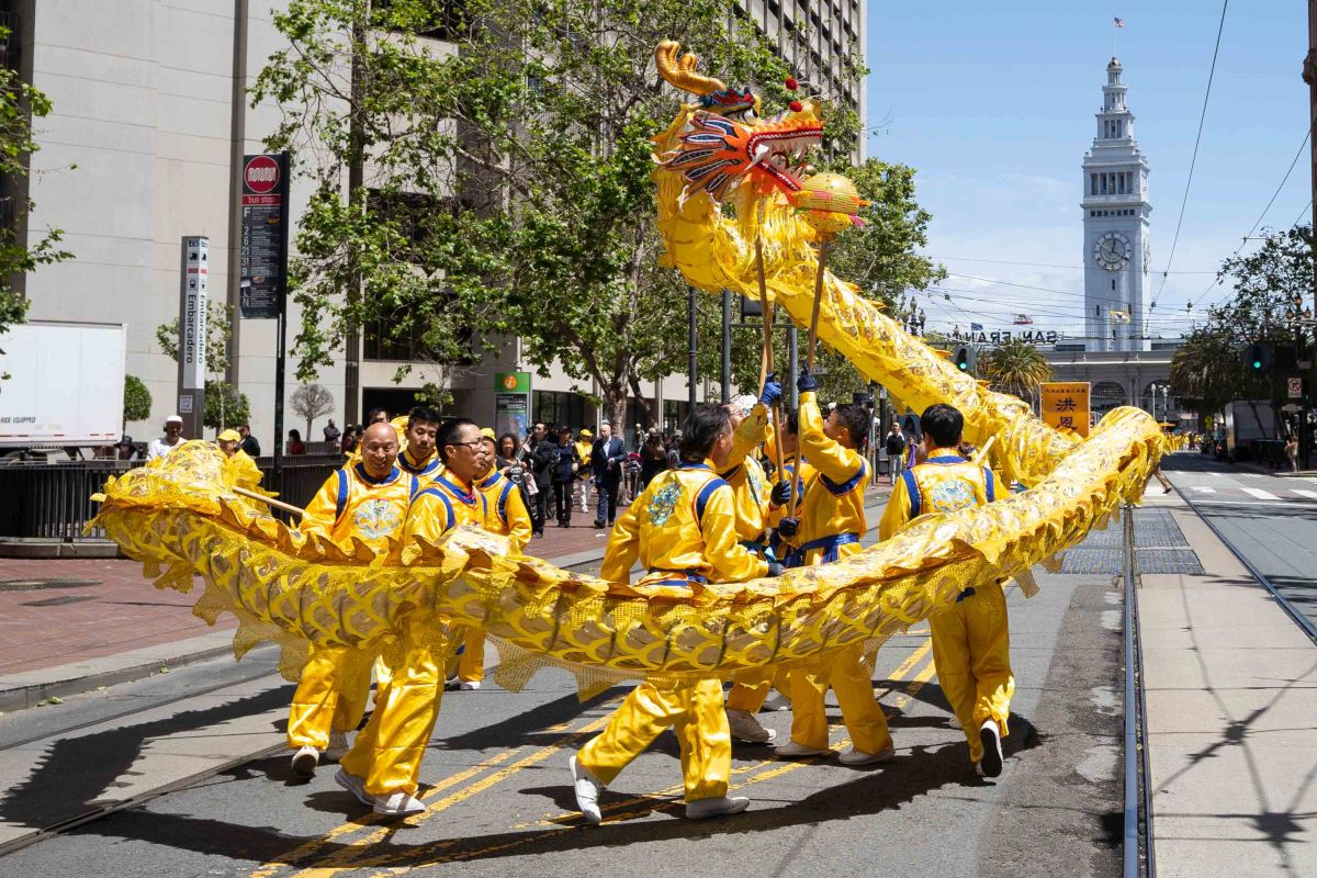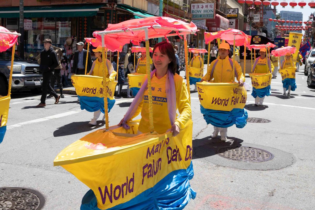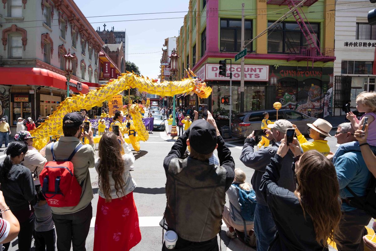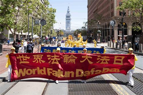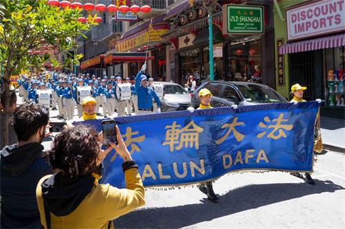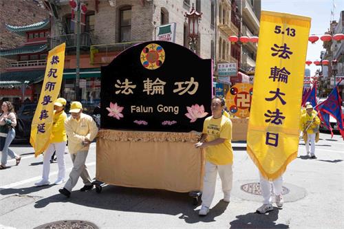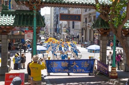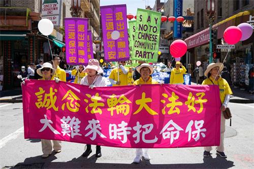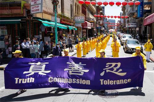 中午十二点,庆祝游行开始。法轮功学员从渡轮大厦出发,沿着市场街,进入唐人街,最后抵达唐人街花园角广场。一路上,法轮功学员为民众送去福音,期盼世人牢记“法轮大法好,真善忍好”,拒绝中共,获得平安。