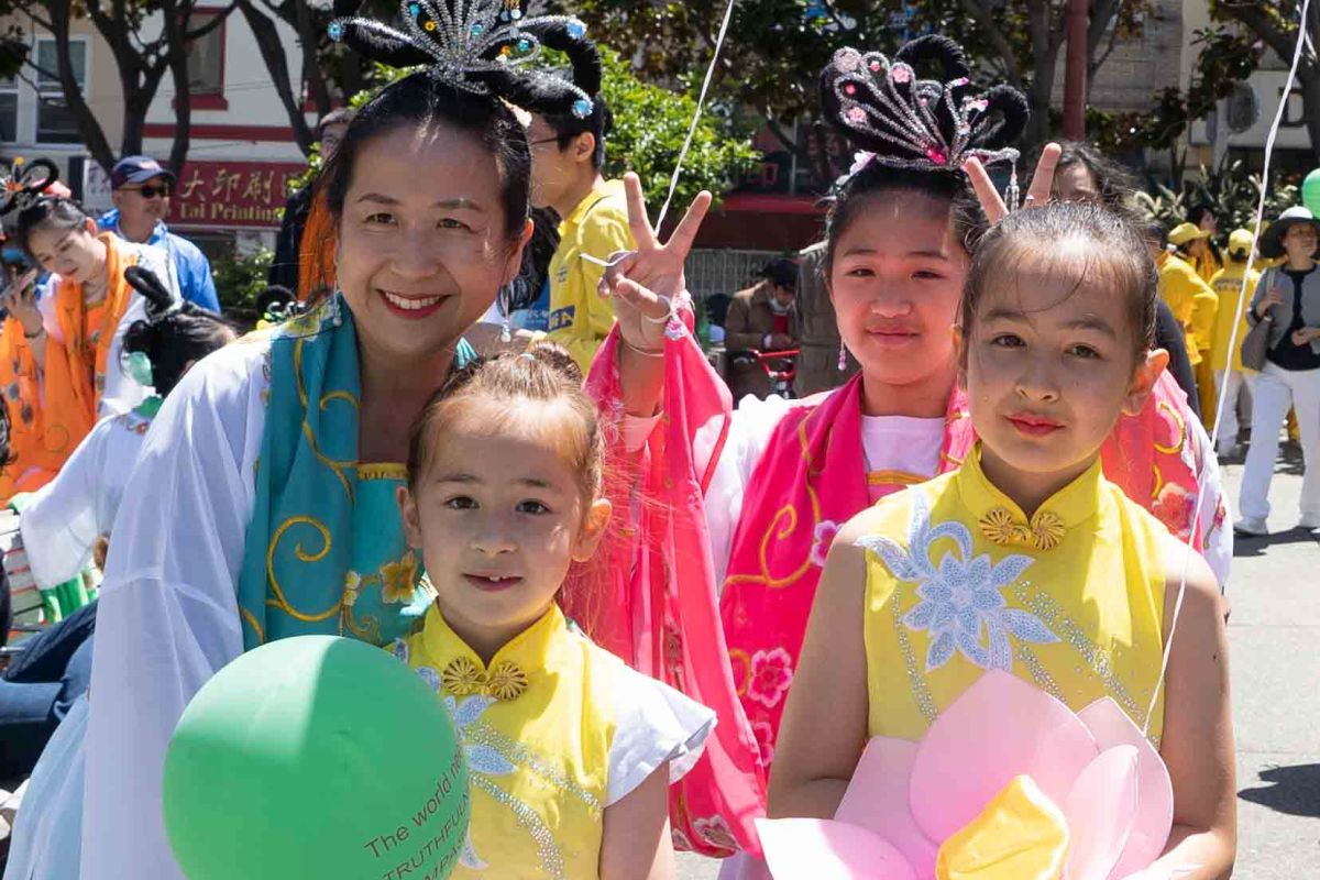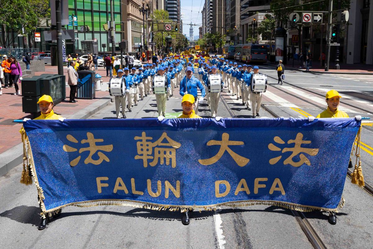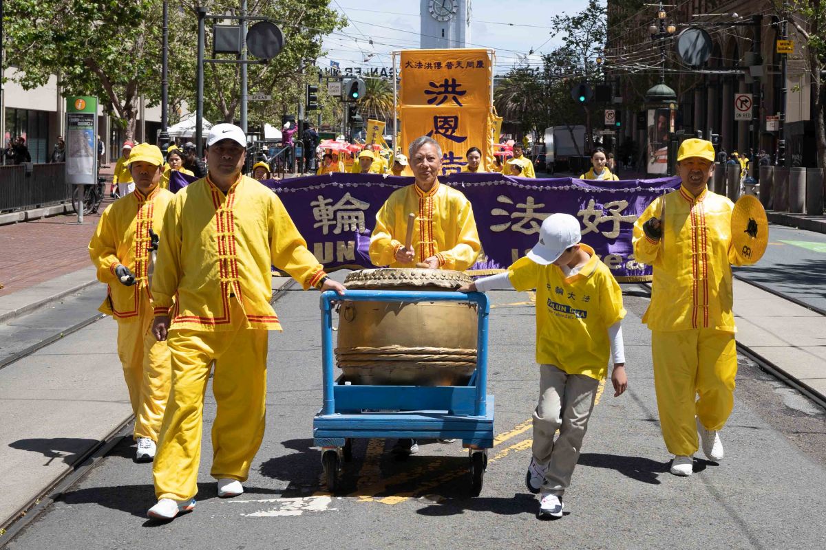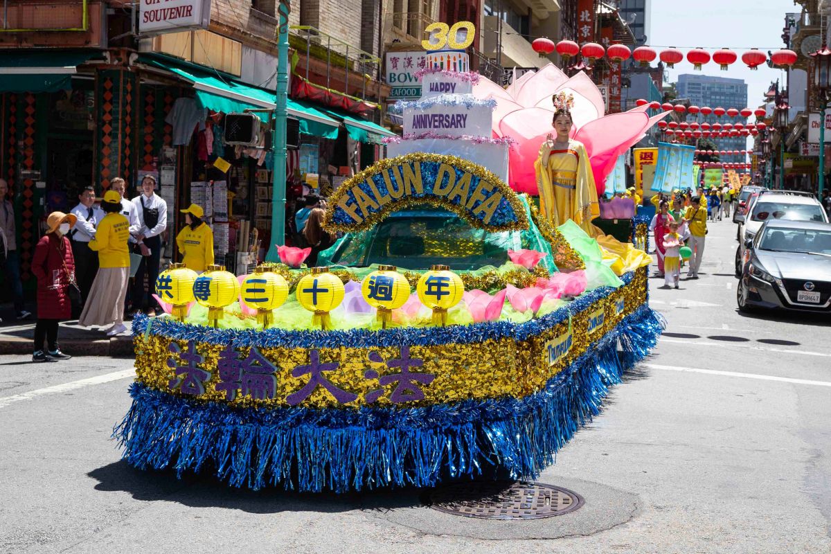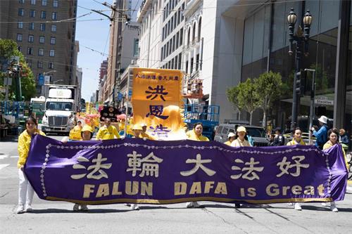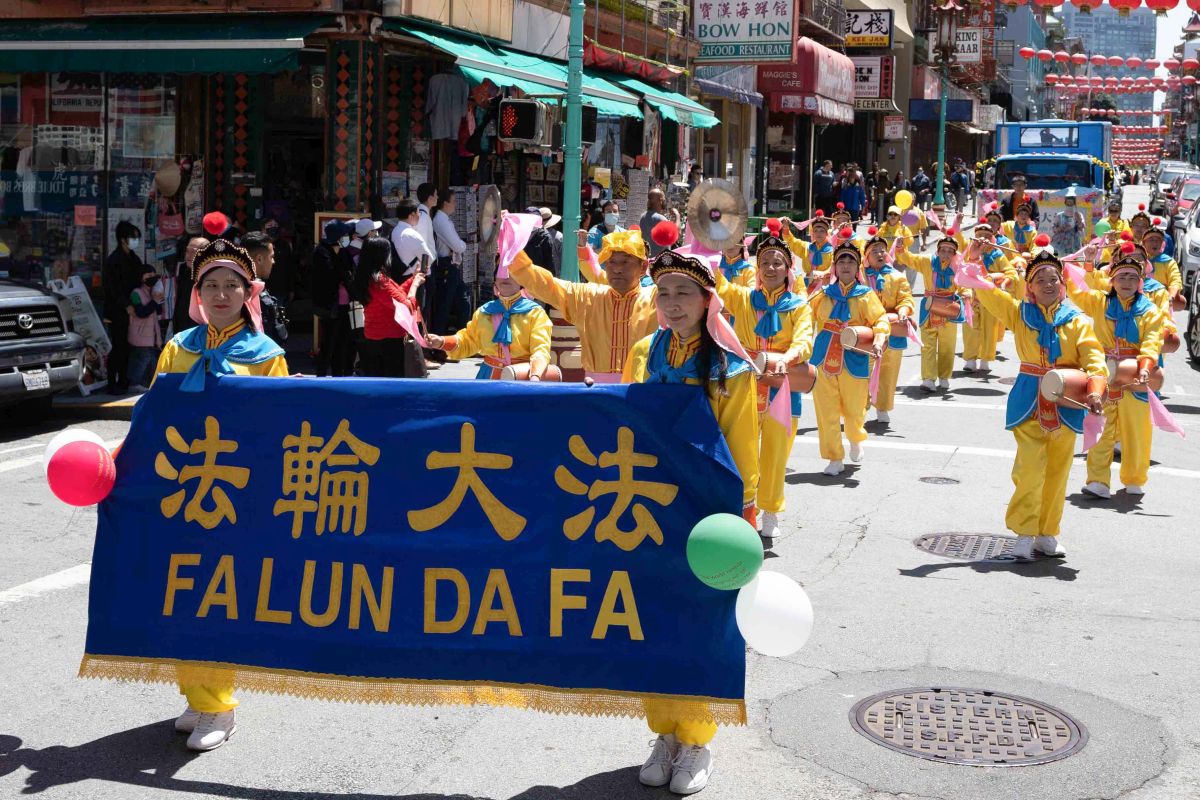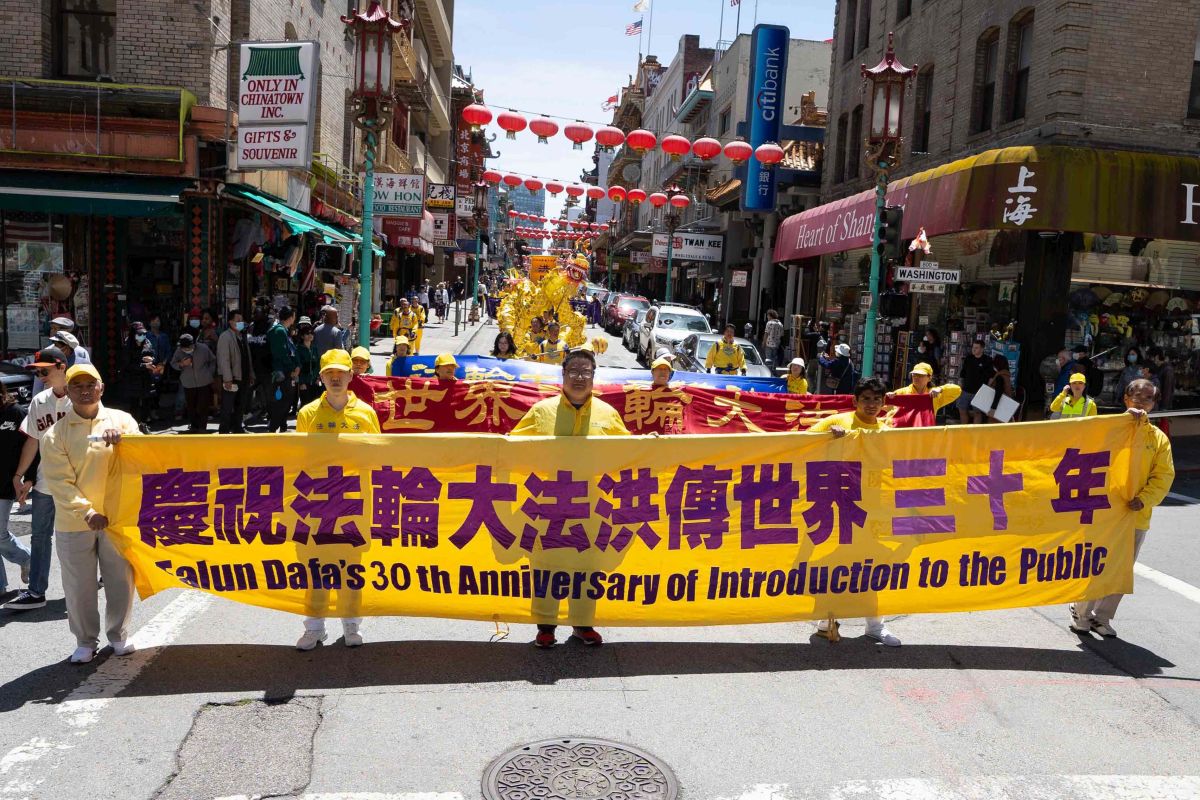 中午十二点,庆祝游行开始。法轮功学员从渡轮大厦出发,沿着市场街,进入唐人街,最后抵达唐人街花园角广场。一路上,法轮功学员为民众送去福音,期盼世人牢记“法轮大法好,真善忍好”,拒绝中共,获得平安。