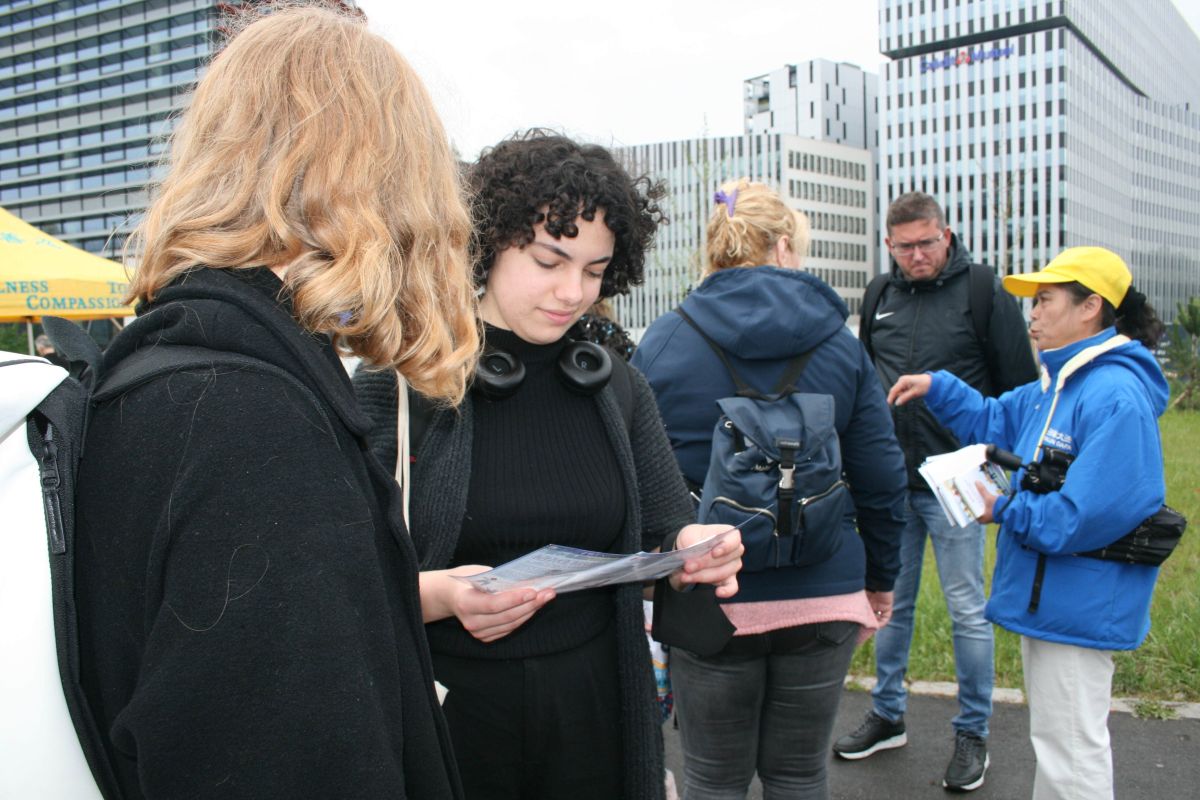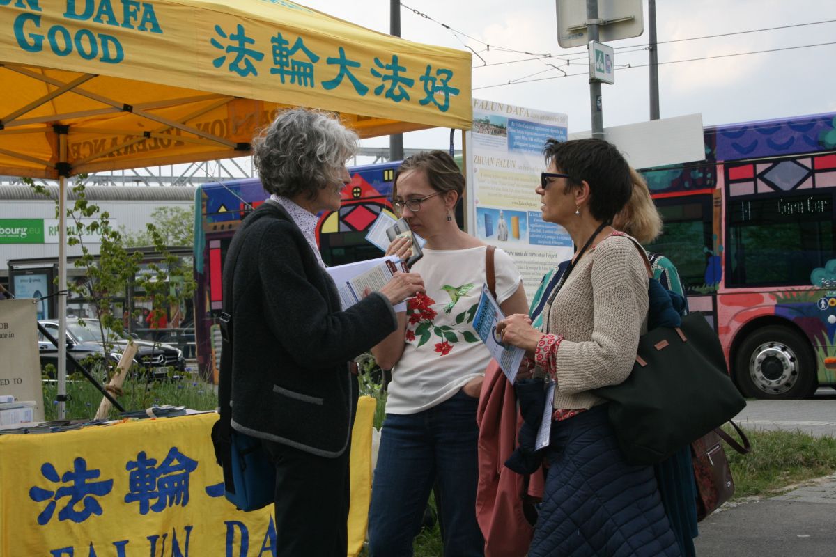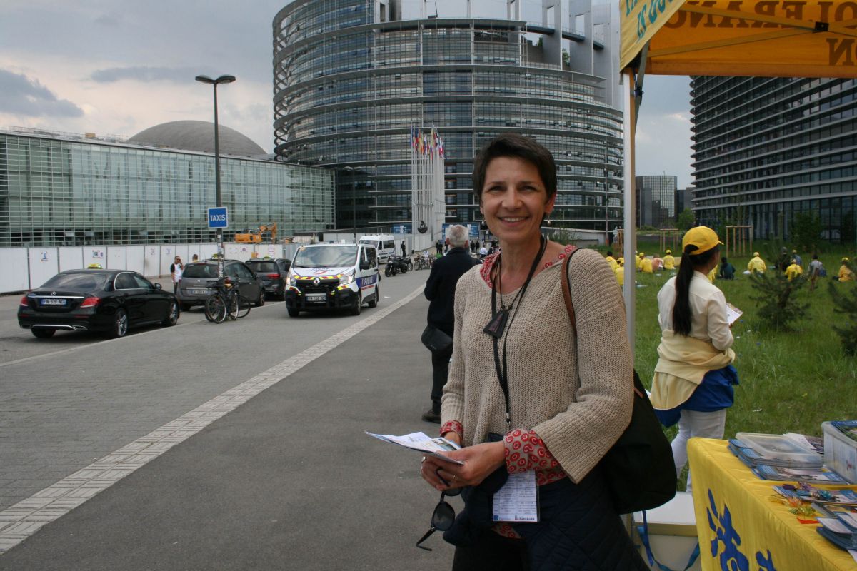 游客维罗妮克·希德女士(Véronique Schied)五月四日看到法轮功学员的功法演示后,停留了很长时间,并和一位德国法轮功学员交谈了很多。她认为:“让人们来关注在中国发生的这一切极其有意义。(中共)在掠夺人们的人权,不让人们通过炼健康的功法,解决日常的问题——对我而言,这就如同对民众的奴役。”“这(中共)掠夺了对每个人而言最重要的:拥有快乐的权力,得到内心的平衡。这样的专政太可怕了。”
