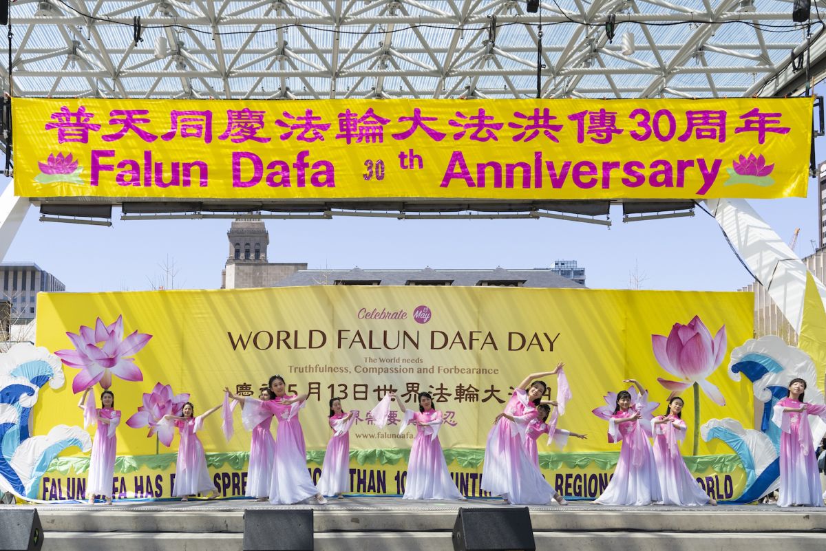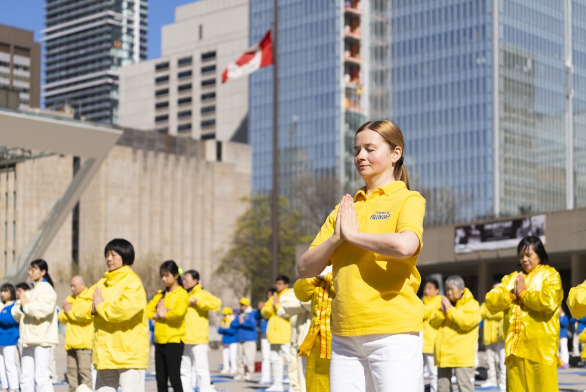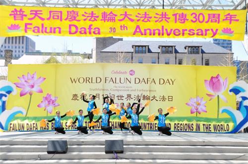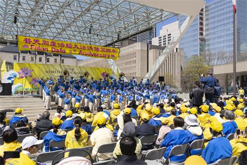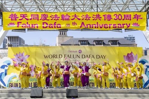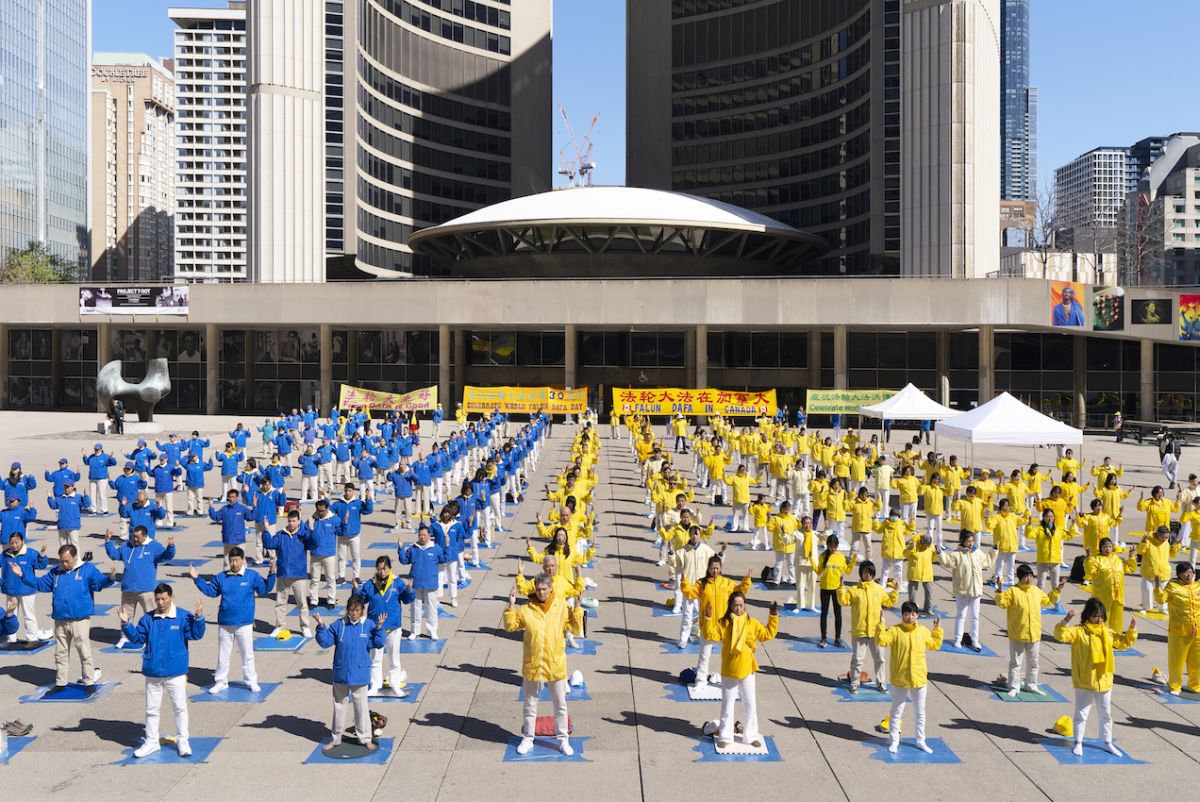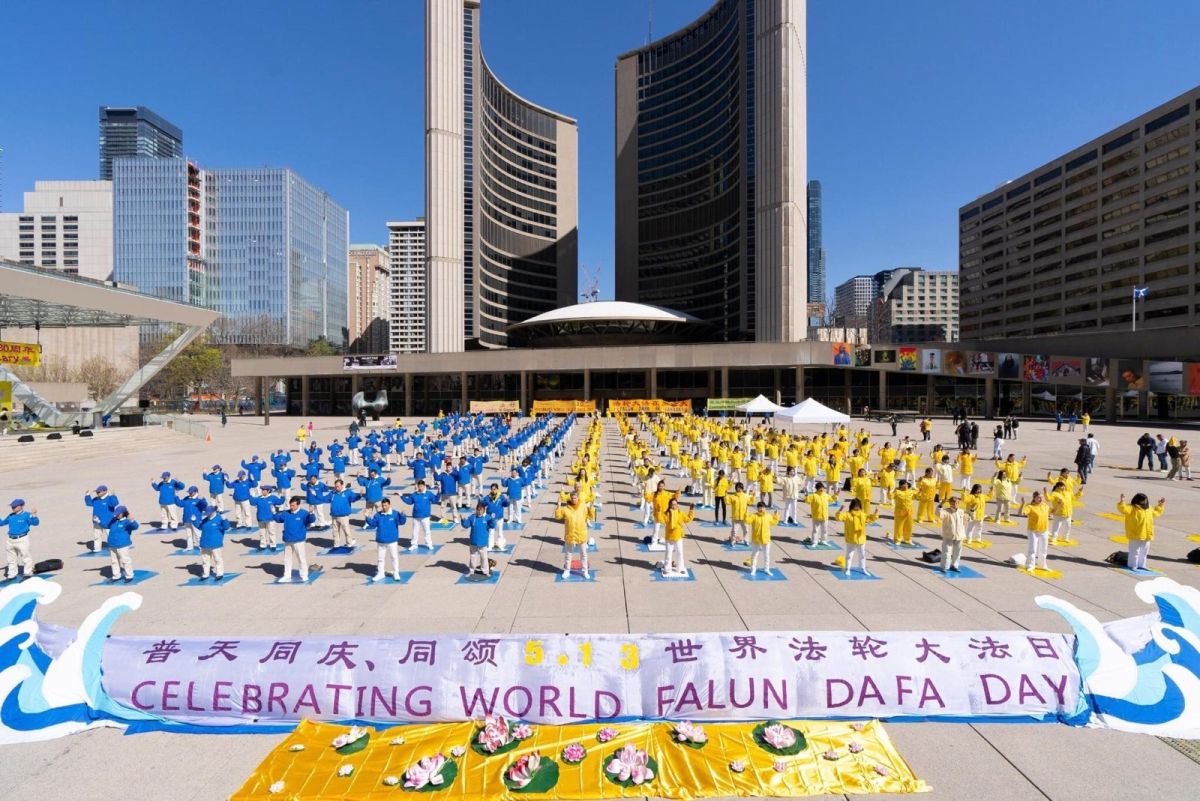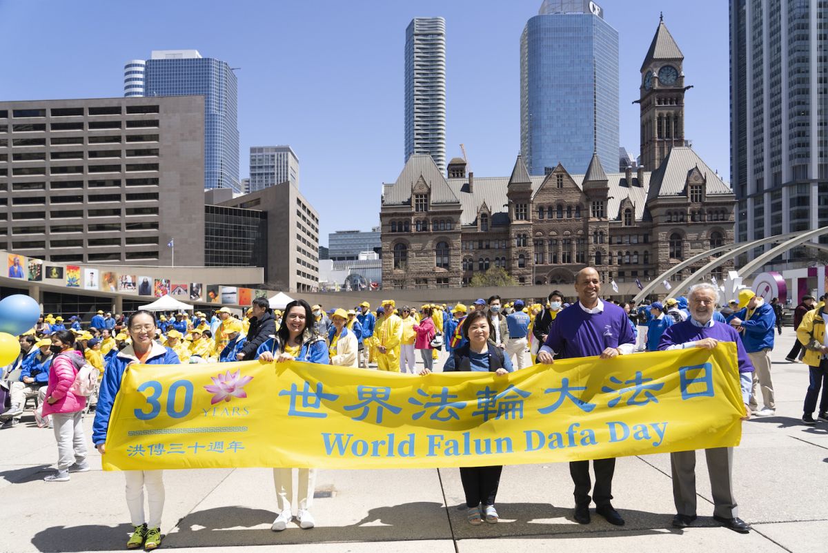 ![]() 图1:二零二二年五月七日,多伦多法轮功学员聚集在多伦多市政厅广场庆祝世界法轮大法日,恭祝师尊生日快乐! |