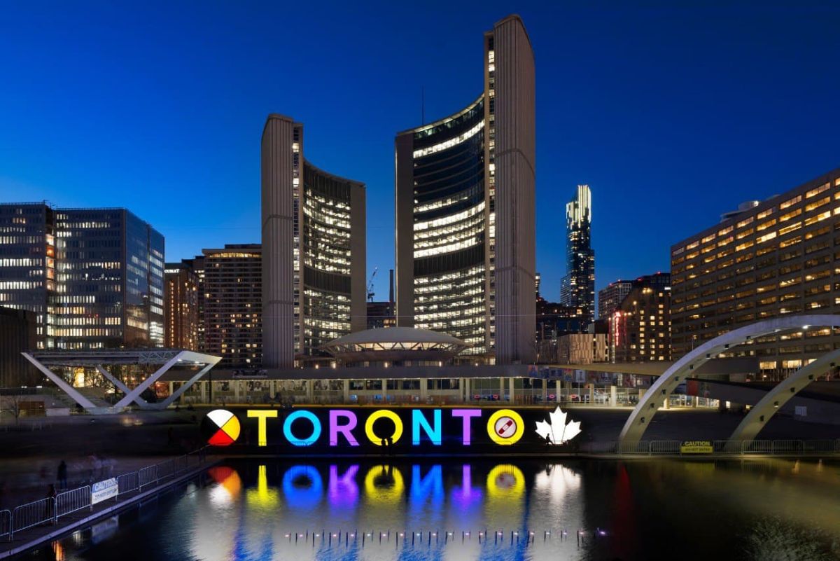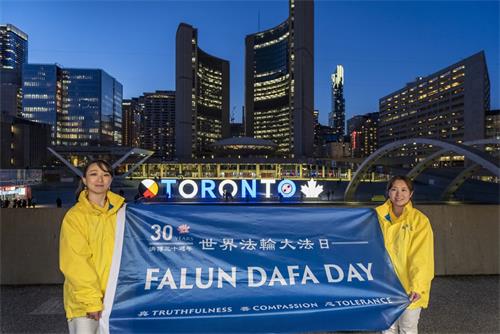 多伦多市政府晚上还为这次庆祝活动亮彩灯,在市政广场上的“TORONTO”标志物,亮起黄色、蓝色和紫色的彩灯,来庆祝“世界法轮大法日”和法轮大法传世三十周年。