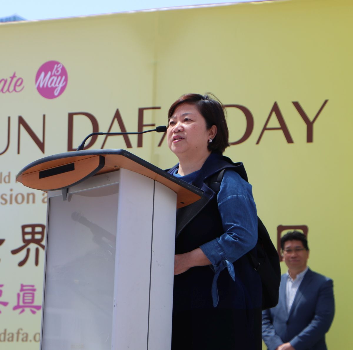 “我很赞叹你们的勇气。你们一直都怀着海纳百川的胸怀,来弘扬真、善、忍这么重要的价值观,并且勇敢的去捍卫基本的人权、自由与民主。我为你们鼓掌。我尊重你们,而且我爱法轮大法这个社区。很感谢你们。”