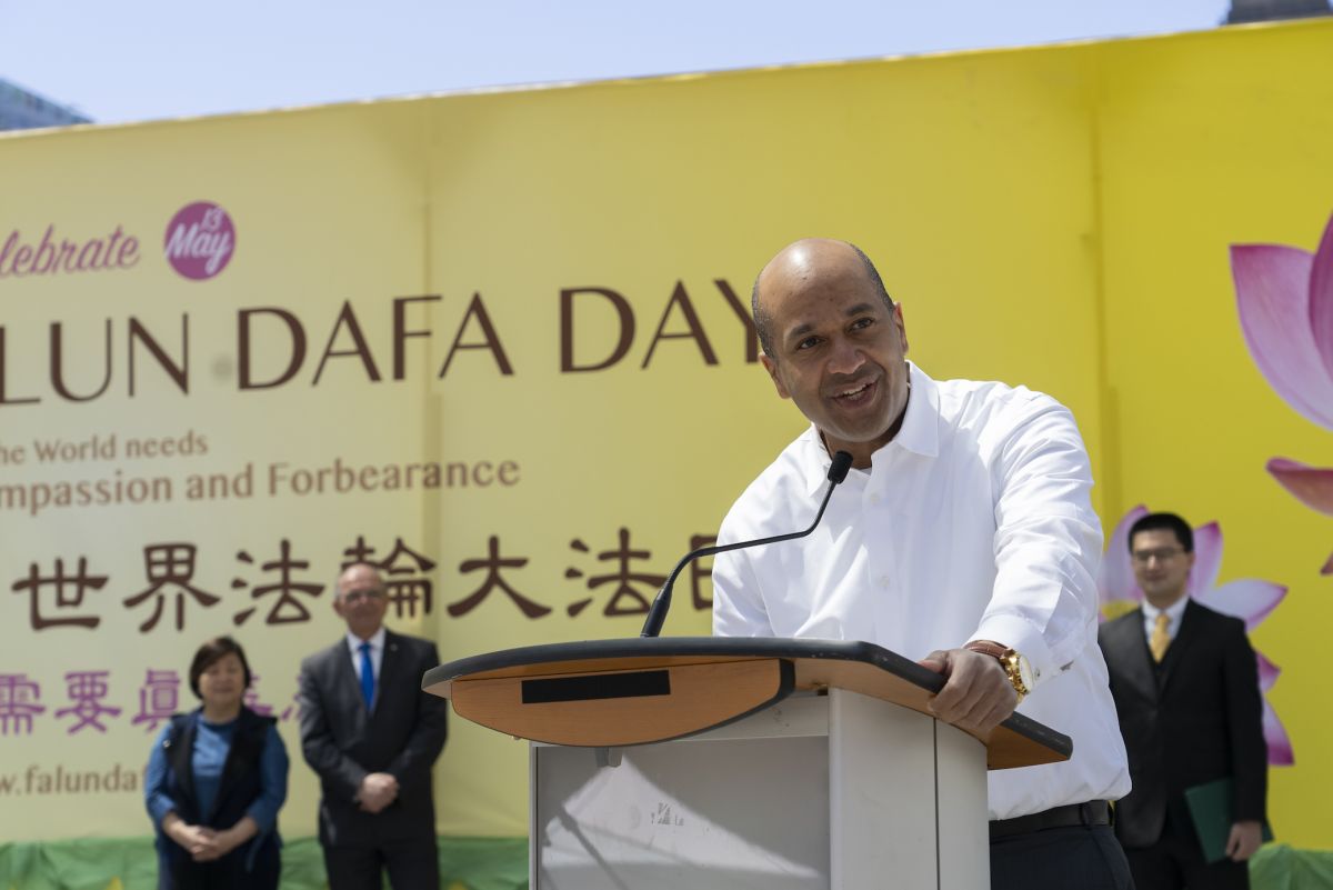 “我有一个梦想,就是梦想有一天,在中国大陆的每一个城市,人们都能够在平和、和谐、开放中庆祝法轮大法日。法轮功学员能够做他们自己想做的事情,而不再需要心存顾虑或直面困境。我们都应该有信心,相信我的这个梦很快就会实现。今天,我以见证人的身份来到这里。作为一名人权律师,我见证了法轮大法群体这几十年来所经历的困难、痛苦和挣扎。我跟加拿大的各个社区、宗教、种族以及文化背景的人们都合作过,作为代理律师帮助过他们。到目前为止,法轮功学员是我见过的贡献最大、最忠诚以及最优秀的加拿大公民。