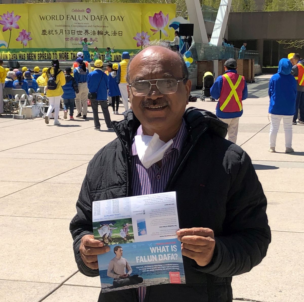 苏美什(Sumesh)先生是一位退休的商业顾问,今天来到市政府广场,非常喜欢法轮功学员表演的节目,他说:“我支持人们的不同的信仰,像在印度,很多传统与舞蹈都来源于对神佛的信仰。”