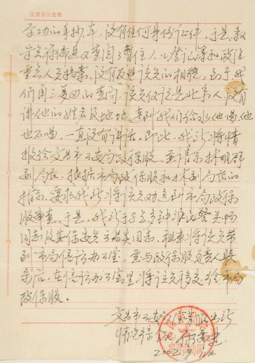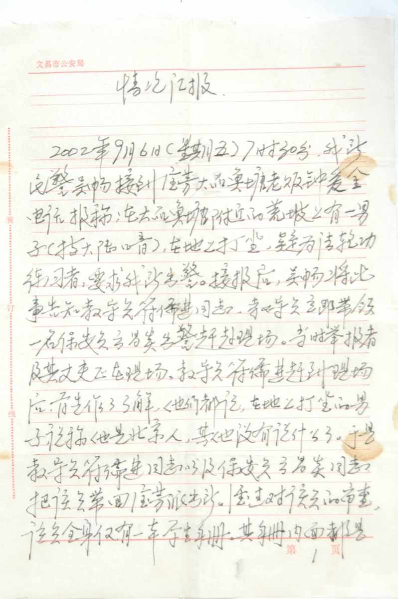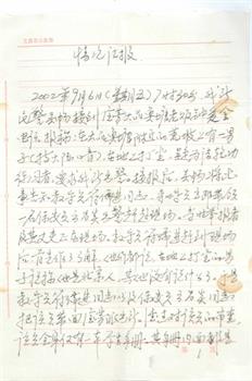 二零零二年九月六日早上七点三十分,杨爱金在住房旁边一个草坪里打坐炼功,被大品鱼塘老板娘钟爱金举报,杨爱金被宝芳派出所教导员符儒进带领保安员云昌贵绑架到派出所,受文昌市公安局副局长林明群指示,要将杨爱金送到文昌市公安局政保股审查,8点多钟宝芳派出所警察吴畅和保安云昌贵又将杨爱金劫持到文昌市公安局,在信访办公室,将人交给付局长林明群,并与政保股负责人进行了联系。(见下图情况汇报)