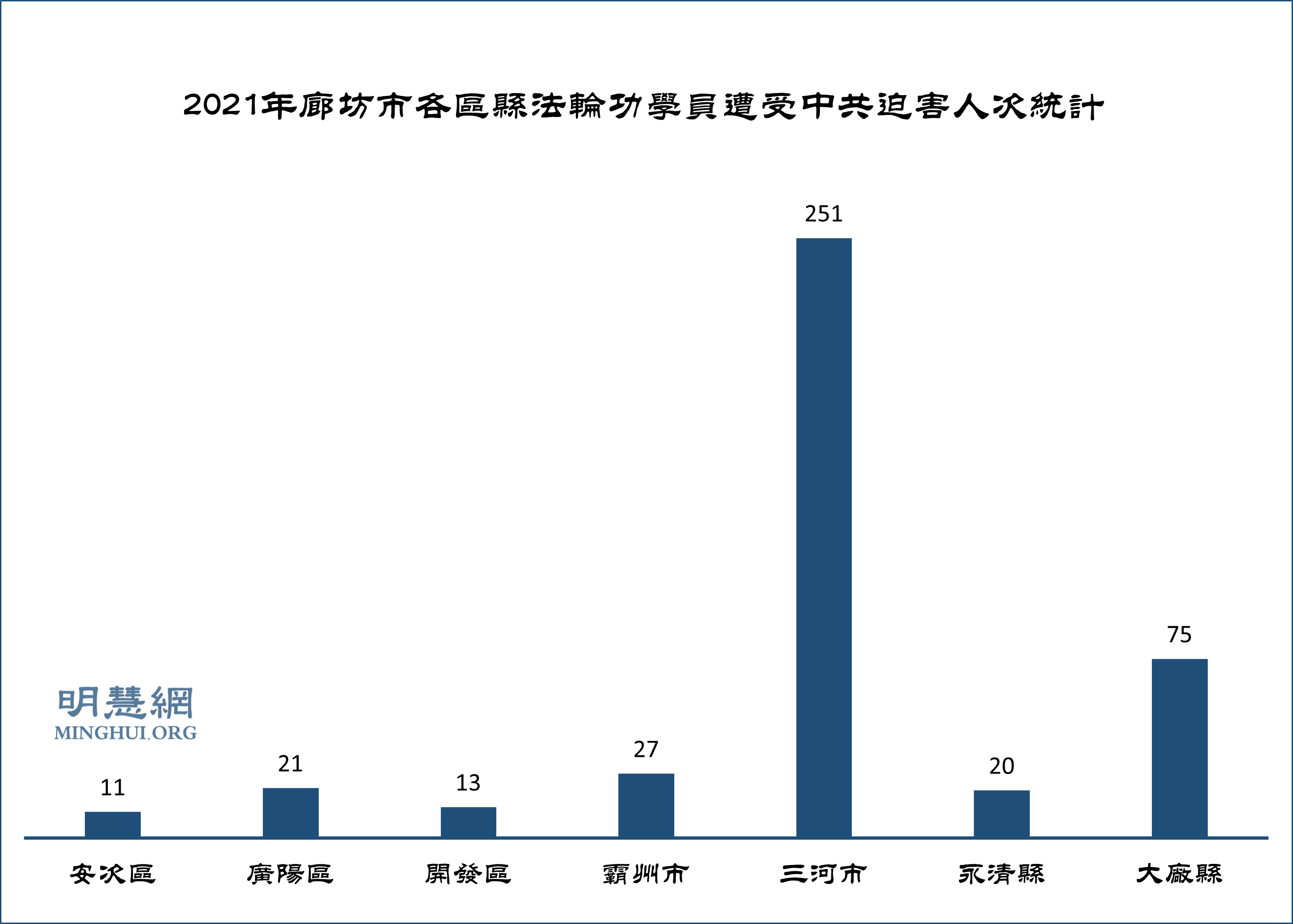 ![]() 图:二零二一年廊坊市各区县法轮功学员遭受中共迫害人次统计 |