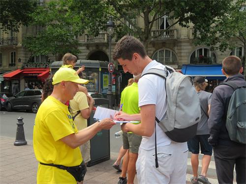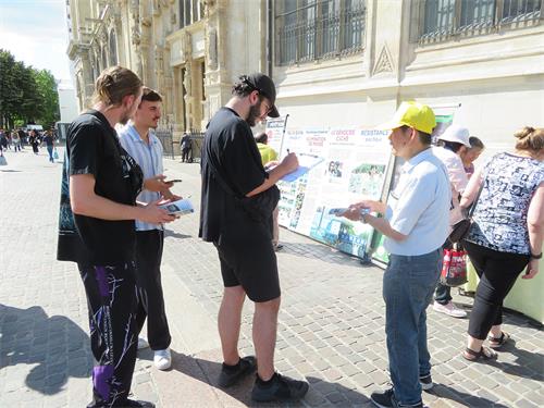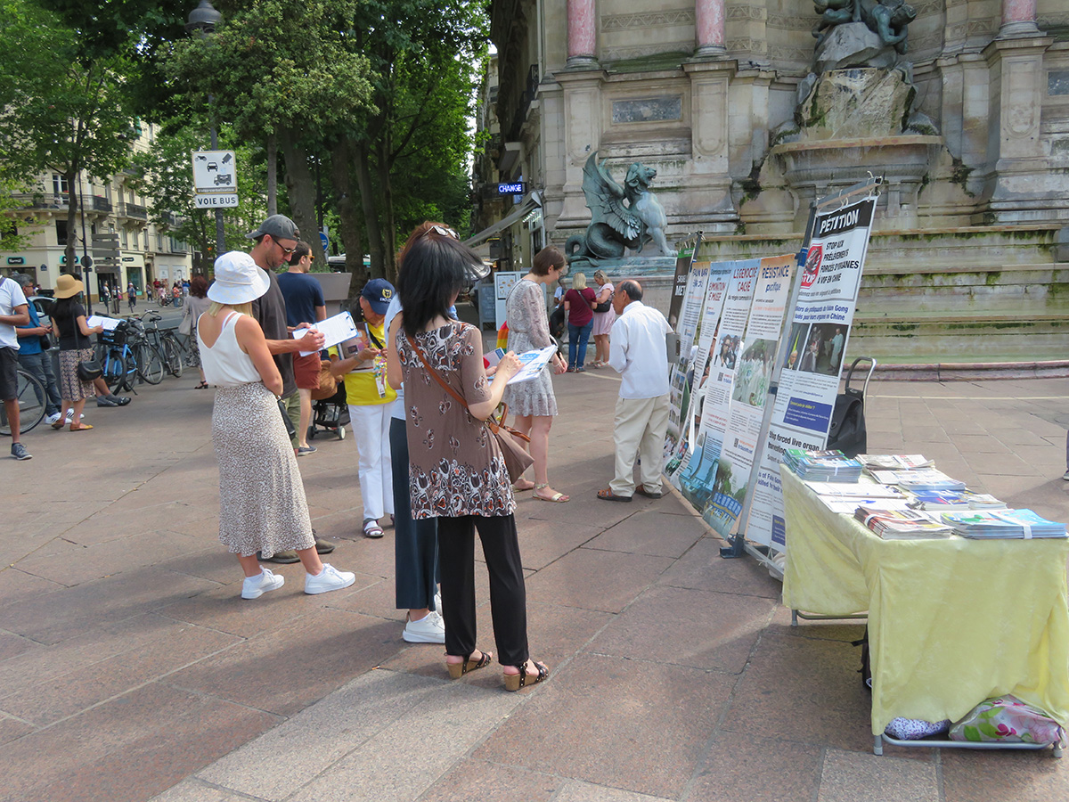 ![]() 图9:二零二二年六月十九日,在巴黎圣米歇尔广场(Place Saint-Michel),人们观看展板,了解法轮功真相,签名支持制止迫害。 |