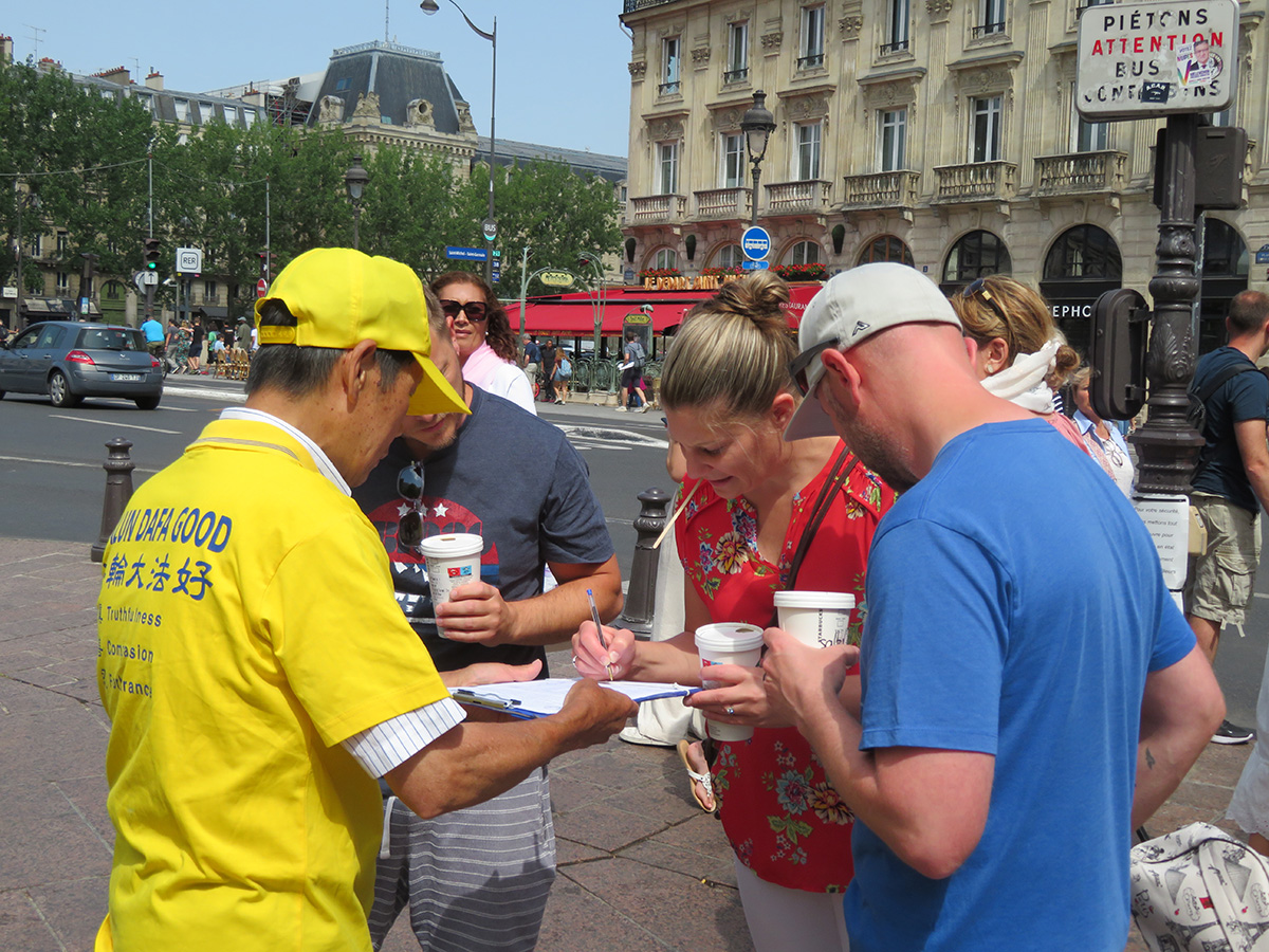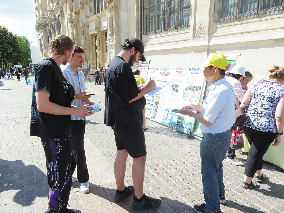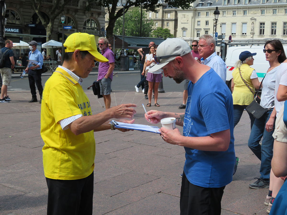 ![]() 图2~3:二零二二年六月十一日, 在巴黎市中心的夏特蕾街区,游人在征签表上签字,支持法轮功学员反迫害。 |