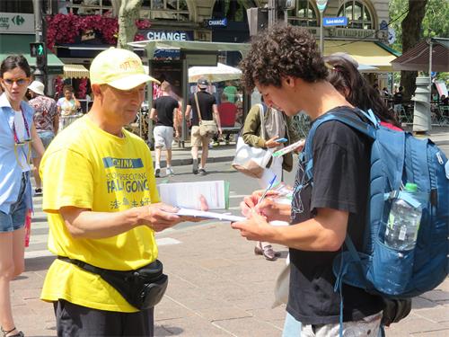 时值酷暑,法轮功学员坚持在烈日下演示法轮功功法,讲真相,人们在了解法轮功在中国被迫害的真相后,纷纷签字反对迫害,谴责中共的暴行。