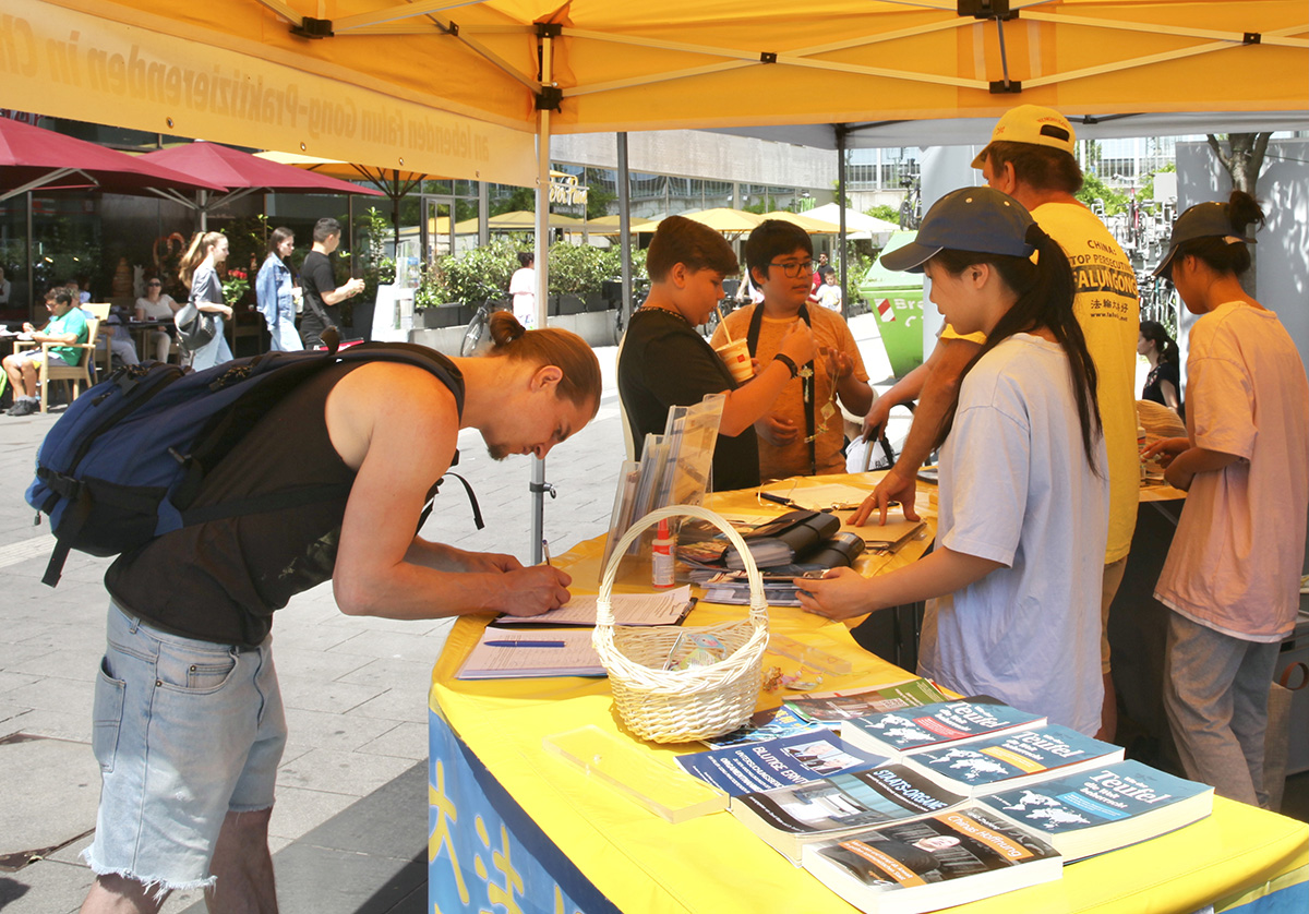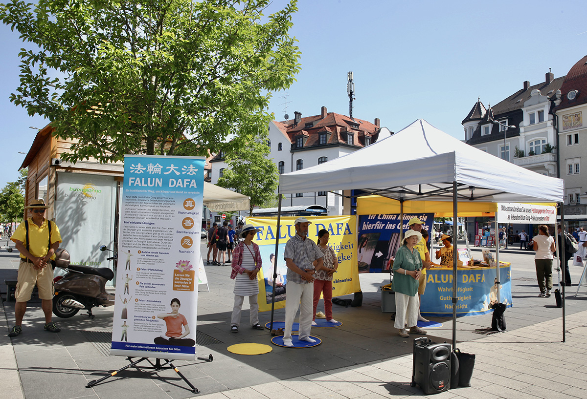 活动快结束的时候,有位德国老先生来到展位前告诉学员,他一直坐在法轮功展台对面的露天咖啡座上,看了学员好久。他说自己感到非常舒服,内心得到平静。学员递给他真相资料,他表示要拿回去好好阅读,了解法轮功到底是怎么回事,为什么中共要打压这么和平的炼功人。