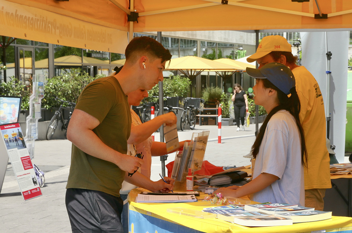 ![]() 图1:二零二二年六月十八日,德国法轮功学员在慕尼黑帕兴(Pasing)车站广场向民众展示法轮功功法,揭露中共迫害法轮功的真相以及活体摘取法轮功学员器官的罪恶。图为民众签名声援法轮功学员反迫害。 |