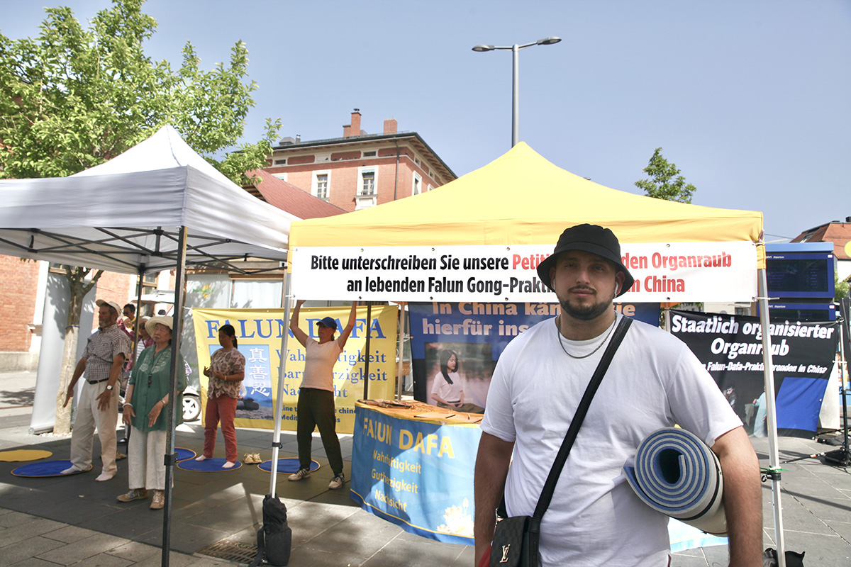 青年埃迪(Eddy)在展位跟学员交谈了挺长时间,他说上次在慕尼黑卡尔斯广场看到过法轮功学员举办的讲真相活动,并签了名。从交谈中埃迪得知法轮功学员只是因为修炼真、善、忍就遭受迫害,二十三年来中共禁止人们修真、善、忍,他说:“作为德国人当然了解自己的(纳粹)历史,我们只是从黑白照片中得知那时候我们这儿发生的事,实在无法想象。可是,当今还一直发生着这样的事,实在太残酷和不可思议了。”