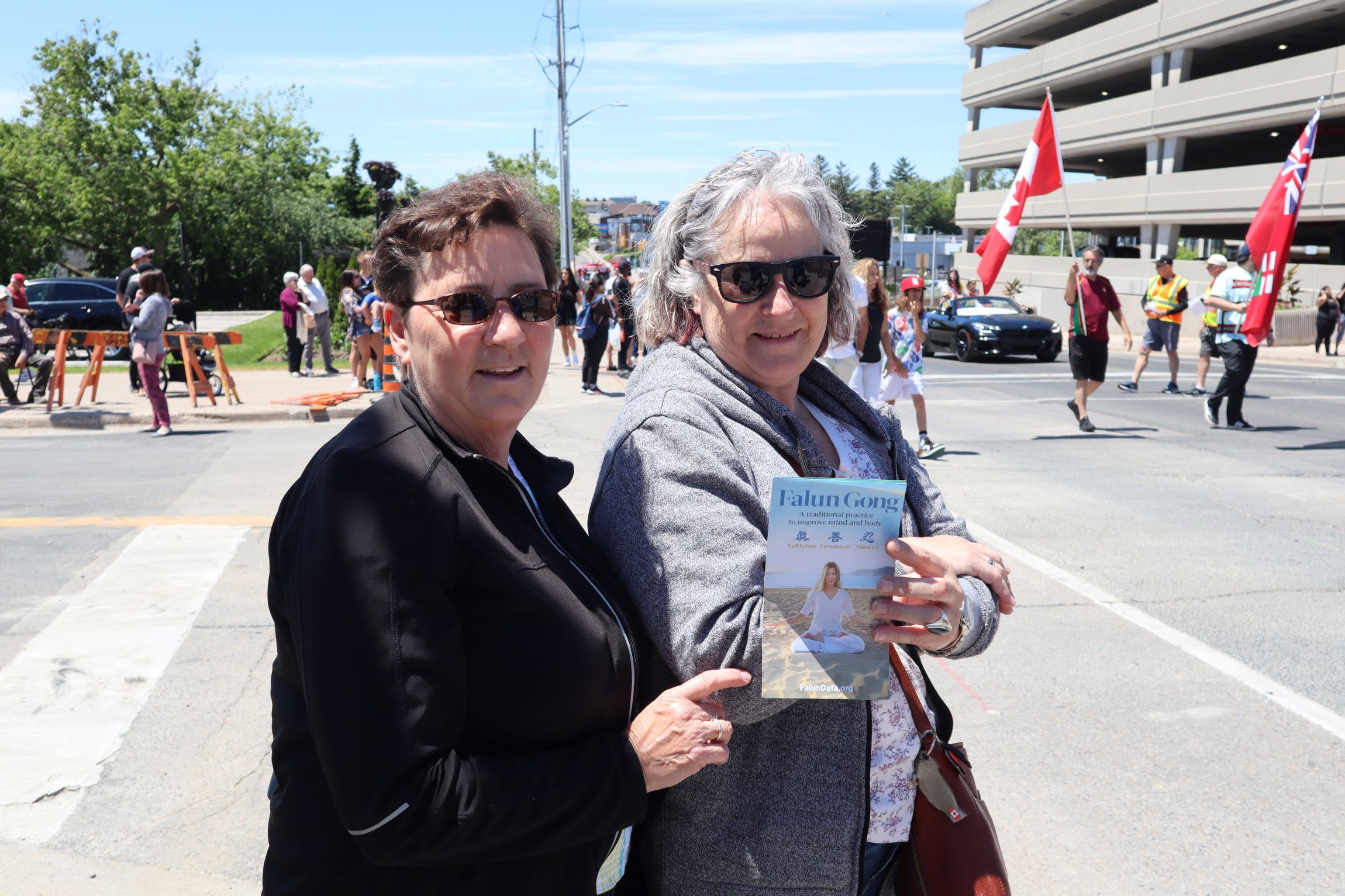 米兰达(Miranda)女士和琳达(Linda)女士在家门口观看游行,看到炼功方阵经过时,跟着法轮功学员开始学习动作。米兰达女士说:“当我看到法轮功学员展示炼功动作时,让我很感兴趣,我也想学。我看到传单上说有免费的教功班,这真的太适合我了。我已经迫不及待了。”